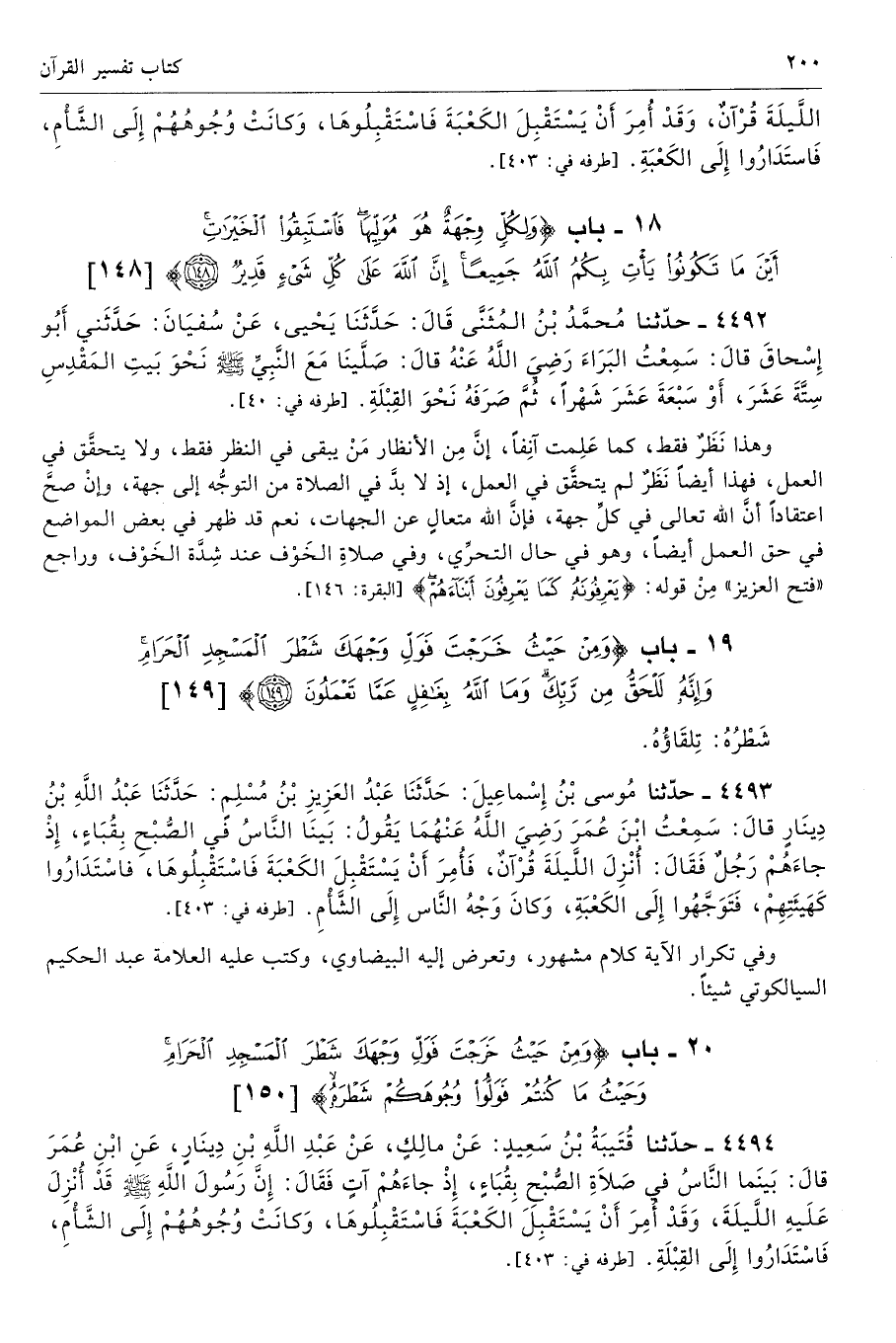 4492 - حَدَّثَنَا مُحَمَّدُ بْنُ الْمُثَنَّى حَدَّثَنَا يَحْيَى عَنْ سُفْيَانَ حَدَّثَنِى أَبُو إِسْحَاقَ قَالَ سَمِعْتُ الْبَرَاءَ - رضى الله عنه - قَالَ صَلَّيْنَا مَعَ النَّبِىِّ - صلى الله عليه وسلم - نَحْوَ بَيْتِ الْمَقْدِسِ سِتَّةَ عَشَرَ - أَوْ سَبْعَةَ عَشَرَ - شَهْرًا، ثُمَّ صَرَفَهُ نَحْوَ الْقِبْلَةِ. أطرافه 40، 399، 4486، 7252 - تحفة 1849