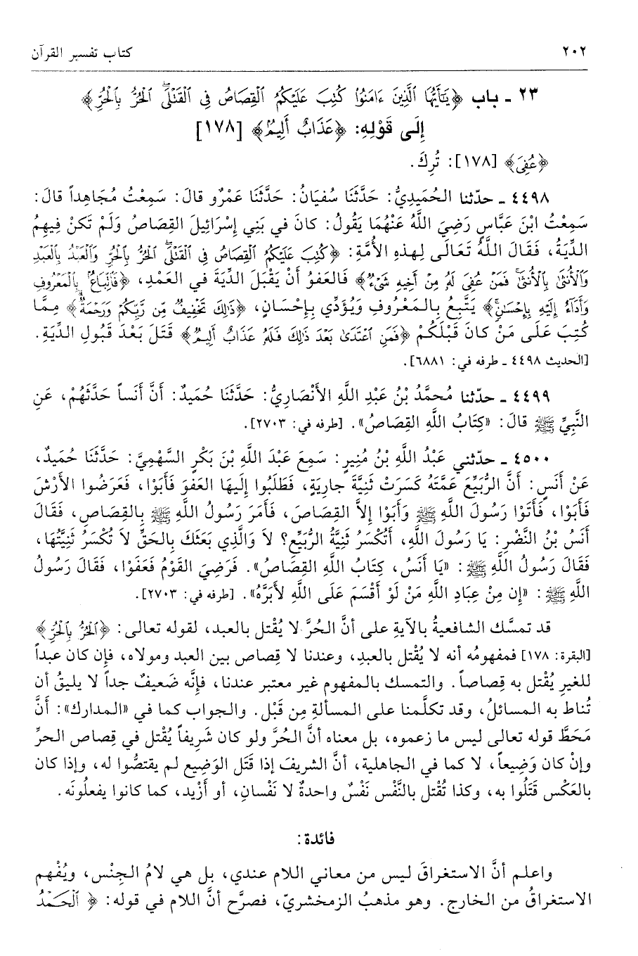 4499 - حَدَّثَنَا مُحَمَّدُ بْنُ عَبْدِ اللَّهِ الأَنْصَارِىُّ حَدَّثَنَا حُمَيْدٌ أَنَّ أَنَسًا حَدَّثَهُمْ عَنِ النَّبِىِّ - صلى الله عليه وسلم - قَالَ «كِتَابُ اللَّهِ الْقِصَاصُ». أطرافه 2703، 2806، 4500، 4611، 6894 - تحفة 749