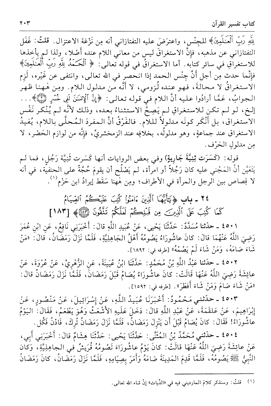 لِلَّهِ رَبِّ الْعَالَمِينَ} للجِنْس، واعترَضَ عليه التفتازاني أنه مِن نَزْغة الاعتزال. قلتُ: غَفَل التفتازاني عن مذهبه، فإِنَّ الاستغراقَ ليس من معاني اللام عنده أَصْلا، ولذا لم يأخذها للاستغراقِ في سائر كتابه. أما الاستغراقُ في قوله تعالى: {الْحَمْدُ لِلَّهِ رَبِّ الْعَالَمِينَ} فإِنَّما حدث مِن أجل أَنَّ جِنْس الحمد إذا انحصر في الله تعالى، وانتفى عن غَيْره، لَزِم الاستغراقُ لا محالةَ، فهو عنده لُزومي، لا أَنَّه من مدلول اللام. ومِن ههنا ظهر الجوابُ، عَمَّا أرادُوا عليه أنَّ اللام في قوله تعالى: {إِنَّ الْإِنْسَانَ لَفِي خُسْرٍ (2)} ... إلخ، لو لم تكن للاستغراقِ لم يَصِحَّ الاستثناءُ بعده، وذلك لأنَّه لم يُنْكر نَفْس الاستغراق، بل أَنْكَر كونَه مدلولًا للام. فالفَرْقُ أنَّ المفردَ المُحلَّى باللام، يُفيدُ الاستغراق عند جماعةٍ، وهو مدلولُه، بخلافِه عند الزمخشريِّ، فإِنَّه من لوازم الحَصْر، لا مِن مدلولِ الحَرْف.