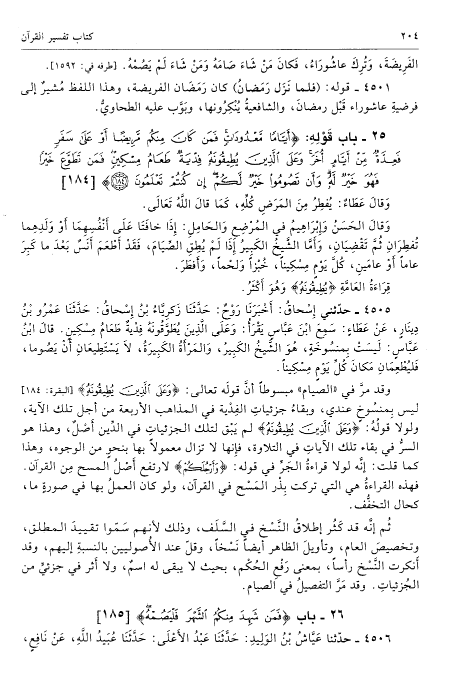 4505 - حَدَّثَنِى إِسْحَاقُ أَخْبَرَنَا رَوْحٌ حَدَّثَنَا زَكَرِيَّاءُ بْنُ إِسْحَاقَ حَدَّثَنَا عَمْرُو بْنُ دِينَارٍ عَنْ عَطَاءٍ سَمِعَ ابْنَ عَبَّاسٍ يَقْرَأُ {وَعَلَى الَّذِينَ يُطِيقُونَهُ فِدْيَةٌ طَعَامُ مِسْكِينٍ} [البقرة: 184]. قَالَ ابْنُ عَبَّاسٍ لَيْسَتْ بِمَنْسُوخَةٍ، هُوَ الشَّيْخُ الْكَبِيرُ وَالْمَرْأَةُ الْكَبِيرَةُ لاَ يَسْتَطِيعَانِ أَنْ يَصُومَا، فَلْيُطْعِمَانِ مَكَانَ كُلِّ يَوْمٍ مِسْكِينًا. تحفة 5945