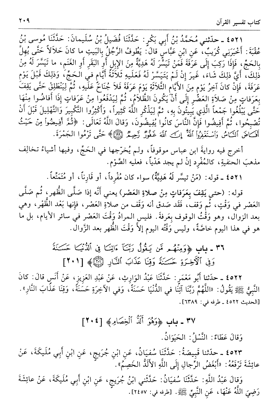 4521 - حَدَّثَنِى مُحَمَّدُ بْنُ أَبِى بَكْرٍ حَدَّثَنَا فُضَيْلُ بْنُ سُلَيْمَانَ حَدَّثَنَا مُوسَى بْنُ عُقْبَةَ أَخْبَرَنِى كُرَيْبٌ عَنِ ابْنِ عَبَّاسٍ قَالَ يَطَوَّفُ الرَّجُلُ بِالْبَيْتِ مَا كَانَ حَلاَلاً حَتَّى يُهِلَّ بِالْحَجِّ، فَإِذَا رَكِبَ إِلَى عَرَفَةَ فَمَنْ تَيَسَّرَ لَهُ هَدِيَّةٌ مِنَ الإِبِلِ أَوِ الْبَقَرِ أَوِ الْغَنَمِ، مَا تَيَسَّرَ لَهُ مِنْ ذَلِكَ أَىَّ ذَلِكَ شَاءَ، غَيْرَ إِنْ لَمْ يَتَيَسَّرْ لَهُ فَعَلَيْهِ ثَلاَثَةُ أَيَّامٍ فِى الْحَجِّ، وَذَلِكَ قَبْلَ يَوْمِ عَرَفَةَ، فَإِنْ كَانَ آخِرُ يَوْمٍ مِنَ الأَيَّامِ الثَّلاَثَةِ يَوْمَ عَرَفَةَ فَلاَ جُنَاحَ عَلَيْهِ، ثُمَّ لِيَنْطَلِقْ حَتَّى يَقِفَ بِعَرَفَاتٍ مِنْ صَلاَةِ الْعَصْرِ إِلَى أَنْ يَكُونَ الظَّلاَمُ، ثُمَّ لِيَدْفَعُوا مِنْ عَرَفَاتٍ إِذَا أَفَاضُوا مِنْهَا حَتَّى يَبْلُغُوا جَمْعًا الَّذِى يُتَبَرَّرُ فِيهِ، ثُمَّ لِيَذْكُرُوا اللَّهَ كَثِيرًا، أَوْ أَكْثِرُوا التَّكْبِيرَ وَالتَّهْلِيلَ قَبْلَ أَنْ تُصْبِحُوا ثُمَّ أَفِيضُوا، فَإِنَّ النَّاسَ كَانُوا يُفِيضُونَ، وَقَالَ اللَّهُ تَعَالَى {ثُمَّ أَفِيضُوا مِنْ حَيْثُ أَفَاضَ النَّاسُ وَاسْتَغْفِرُوا اللَّهَ إِنَّ اللَّهَ غَفُورٌ رَحِيمٌ (199)} حَتَّى تَرْمُوا الْجَمْرَةَ. تحفة 6369