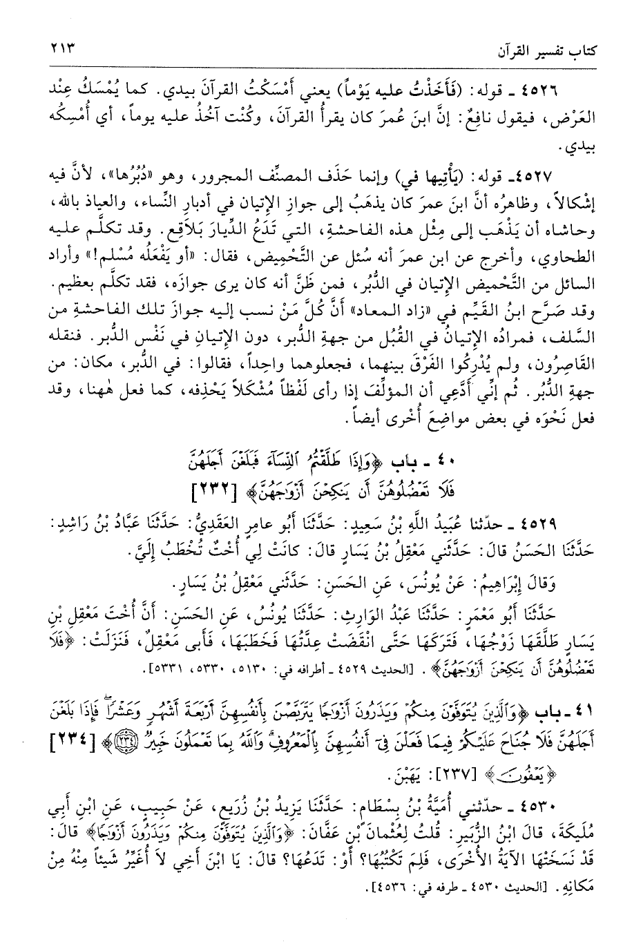 4527 - قوله: (يَأْتِيها في) وإنما حَذَف المصنِّف المجرور، وهو «دُبُرُها»، لأنَّ فيه إشْكالًا، وظاهرُه أنَّ ابنَ عمرَ كان يذهَبُ إلى جوازِ الإِتيان في أدبارِ النِّساء، والعياذ بالله، وحاشاه أن يَذْهَب إلى مِثْل هذه الفاحشةِ، التي تَدَعُ الدِّيارَ بَلاَقِع. وقد تكلَّم عليه الطحاوي، وأخرج عن ابن عمرَ أنه سُئل عن التَّحْمِيض، فقال: «أو يَفْعَلُه مُسْلم!» وأراد السائل من التَّحْميض الإِتيان في الدُّبُر، فمن ظَنَّ أنه كان يرى جوازَه، فقد تكلَّم بعظيم. وقد صَرَّح ابنُ القَيِّم في «زاد المعاد» أَنَّ كُلَّ مَنْ نسب إليه جوازَ تلك الفاحشةِ من السَّلف، فمرادُه الإِتيانُ في القُبُل من جهةِ الدُّبر، دون الإِتيانِ في نَفْس الدُّبر. فنقله القَاصِرُون، ولم يُدْرِكُوا الفَرْقَ بينهما، فجعلوهما واحِدًا، فقالوا: في الدُّبر، مكان: من جهةِ الدُّبُر. ثُم إنِّي أَدَّعِي أن المؤلِّفَ إذا رأى لَفْظًا مُشْكَلًا يَحْذِفه، كما فعل ههنا، وقد فعل نَحْوَه في بعض مواضِعَ أُخْرى أيضًا.