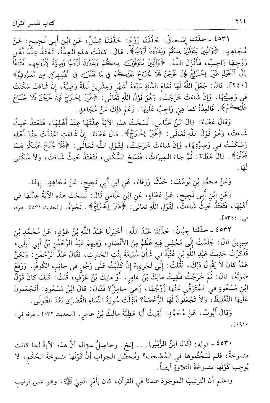 4531 - حَدَّثَنَا إِسْحَاقُ حَدَّثَنَا رَوْحٌ حَدَّثَنَا شِبْلٌ عَنِ ابْنِ أَبِى نَجِيحٍ عَنْ مُجَاهِدٍ {وَالَّذِينَ يُتَوَفَّوْنَ مِنْكُمْ وَيَذَرُونَ أَزْوَاجًا} قَالَ كَانَتْ هَذِهِ الْعِدَّةُ تَعْتَدُّ عِنْدَ أَهْلِ زَوْجِهَا وَاجِبٌ، فَأَنْزَلَ اللَّهُ {وَالَّذِينَ يُتَوَفَّوْنَ مِنْكُمْ وَيَذَرُونَ أَزْوَاجًا وَصِيَّةً لِأَزْوَاجِهِمْ مَتَاعًا إِلَى الْحَوْلِ غَيْرَ إِخْرَاجٍ فَإِنْ خَرَجْنَ فَلَا جُنَاحَ عَلَيْكُمْ فِي مَا فَعَلْنَ فِي أَنْفُسِهِنَّ مِنْ مَعْرُوفٍ} [البقرة: 240] قَالَ جَعَلَ اللَّهُ لَهَا تَمَامَ السَّنَةِ سَبْعَةَ أَشْهُرٍ وَعِشْرِينَ لَيْلَةً وَصِيَّةً، إِنْ شَاءَتْ سَكَنَتْ فِى وَصِيَّتِهَا، وَإِنْ شَاءَتْ خَرَجَتْ، وَهْوَ قَوْلُ اللَّهِ تَعَالَى {غَيْرَ إِخْرَاجٍ فَإِنْ خَرَجْنَ فَلَا جُنَاحَ عَلَيْكُمْ} [البقرة: 240] فَالْعِدَّةُ كَمَا هِىَ وَاجِبٌ عَلَيْهَا.