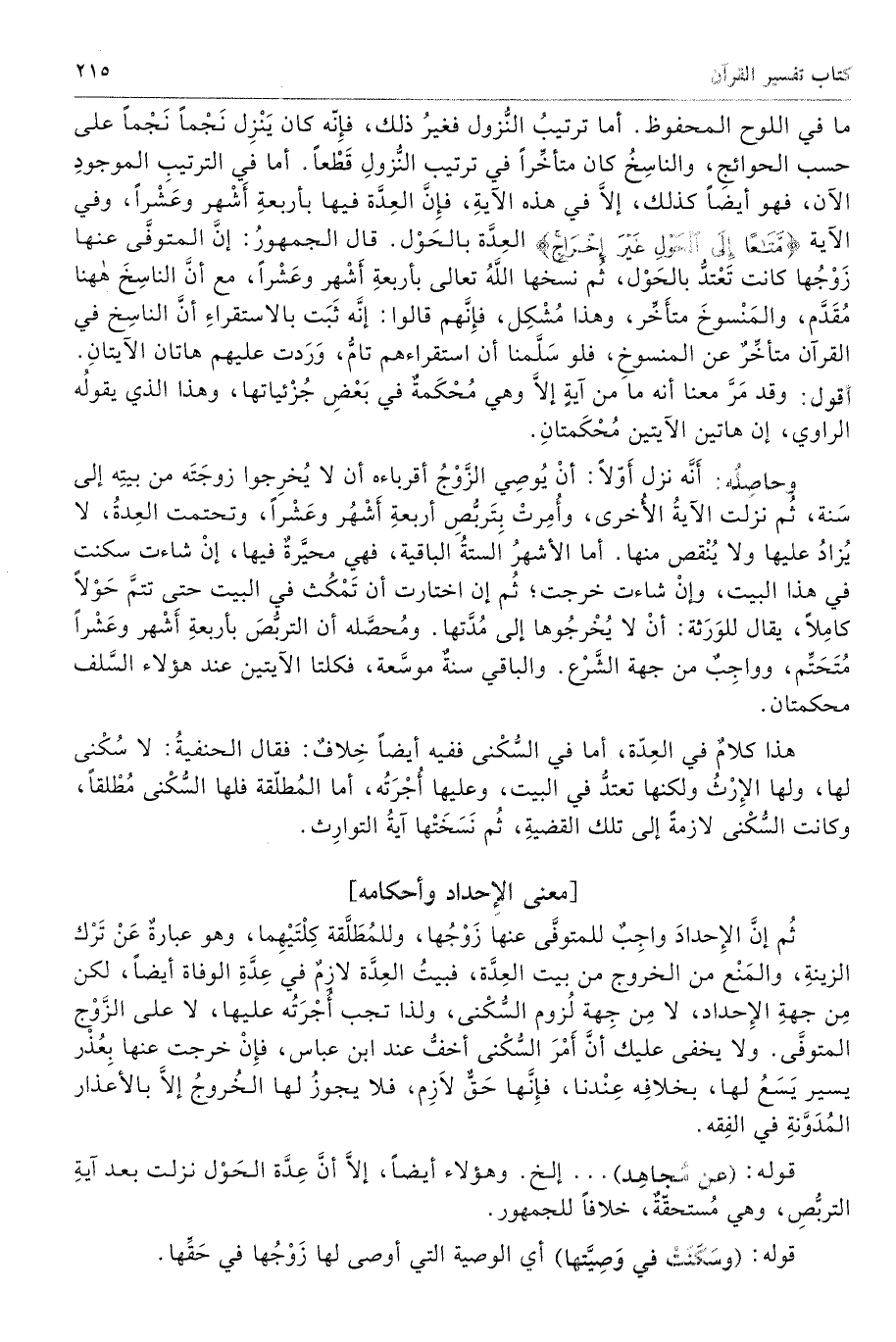 ما في اللوح المحفوظ. أما ترتيبُ النُّزول فغيرُ ذلك، فإِنّه كان يَنْزِل نَجْمًا نَجْما على حسب الحوائجِ، والناسِخُ كان متأخِّرًا في ترتيب النُّزولِ قَطْعًا. أما في الترتيبِ الموجودِ الآن، فهو أيضًا كذلك، إلَّا في هذه الآيةِ، فإِنَّ العِدَّة فيها بأربعةِ أَشْهر وعَشْرًا، وفي الآية {مَتَاعًا إِلَى الْحَوْلِ غَيْرَ إِخْرَاجٍ} العِدَّة بالحَوْل. قال الجمهورُ: إنَّ المتوفَّى عنها زَوْجُها كانت تَعْتدُّ بالحَوْل، ثُم نسخها اللَّهُ تعالى بأربعةِ أَشْهر وعَشْرًا، مع أنَّ الناسِخَ ههنا مُقَدَّم، والمَنْسوخَ متأَخِّر، وهذا مُشْكِل، فإِنَّهم قالوا: إنَّه ثَبَت بالاستقراءِ أنَّ الناسِخ في القرآن متأخِّرٌ عن المنسوخِ، فلو سَلَّمنا أن استقراءهم تامُّ، وَرَدت عليهم هاتان الآيتانِ. أقول: وقد مَرَّ معنا أنه ما من آيةٍ إلَّا وهي مُحْكَمةٌ في بَعْضِ جُزْئياتِا، وهذا الذي يقولُه الراوي، أن هاتين الآيتين مُحْكَمتانِ.