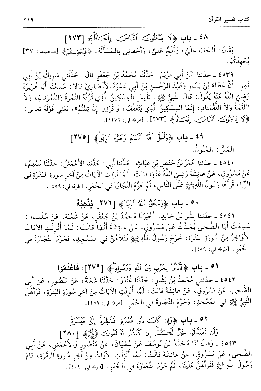 4542 - حَدَّثَنِى مُحَمَّدُ بْنُ بَشَّارٍ حَدَّثَنَا غُنْدَرٌ حَدَّثَنَا شُعْبَةُ عَنْ مَنْصُورٍ عَنْ أَبِى الضُّحَى عَنْ مَسْرُوقٍ عَنْ عَائِشَةَ قَالَتْ لَمَّا أُنْزِلَتِ الآيَاتُ مِنْ آخِرِ سُورَةِ الْبَقَرَةِ قَرَأَهُنَّ النَّبِىُّ - صلى الله عليه وسلم - فِى الْمَسْجِدِ، وَحَرَّمَ التِّجَارَةَ فِى الْخَمْرِ. أطرافه 459، 2084، 2226، 4540، 4541، 4543 - تحفة 17636