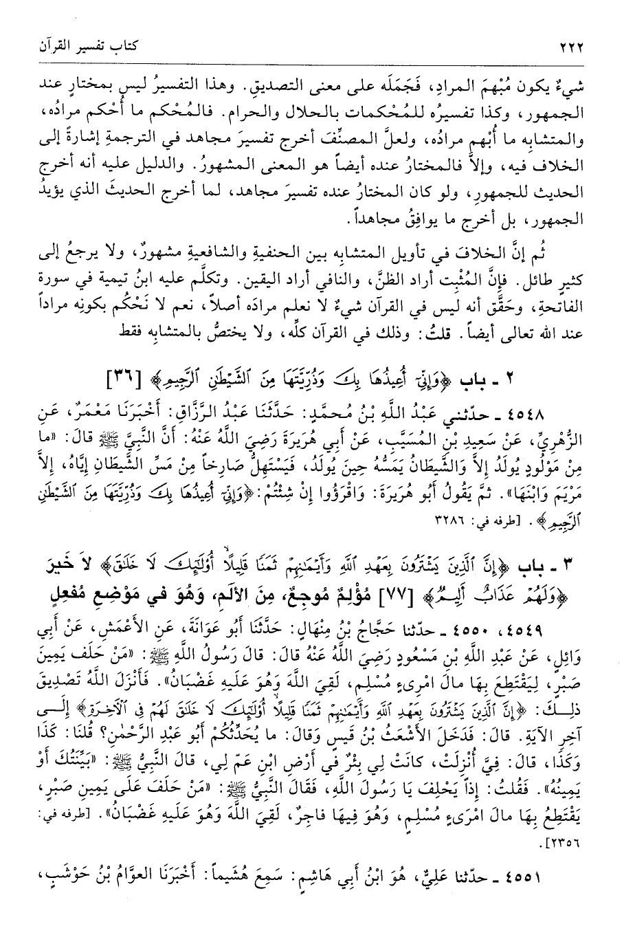 شيءٌ يكون مُبْهمَ المرادِ، فَجَمَلَه على معنى التصديقِ. وهذا التفسيرُ ليس بمختارٍ عند الجمهور، وكذا تفسيرُه للمُحْكمات بالحلال والحرام. فالمُحْكم ما أُحْكم مرادُه، والمتشابِه ما أُبْهم مرادُه، ولعلَّ المصنِّفَ أخرج تفسيرَ مجاهد في الترجمةِ إشارةً إلى الخلاف فيه، وإلَّا فالمختارُ عنده أيضًا هو المعنى المشهورُ. والدليل عليه أنه أخرج الحديث للجمهورِ، ولو كان المختارُ عنده تفسيرَ مجاهد، لما أخرج الحديثَ الذي يؤيدُ الجمهور، بل أخرج ما يوافِقُ مجاهدًا.
