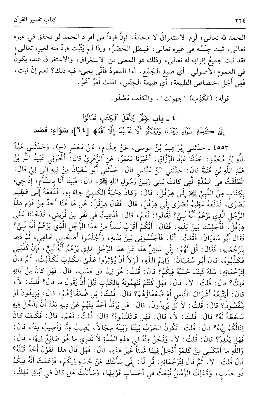 4 - باب {قُلْ يَا أَهْلَ الْكِتَابِ تَعَالَوْا إِلَى كَلِمَةٍ سَوَاءٍ بَيْنَنَا وَبَيْنَكُمْ أَلَّا نَعْبُدَ إِلَّا اللَّهَ} [آل عمران: 64] سَوَاءٌ: قَصْدٌ