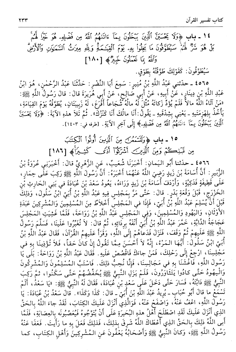 14 - باب {وَلَا يَحْسَبَنَّ الَّذِينَ يَبْخَلُونَ بِمَا آتَاهُمُ اللَّهُ مِنْ فَضْلِهِ هُوَ خَيْرًا لَهُمْ بَلْ هُوَ شَرٌّ لَهُمْ سَيُطَوَّقُونَ مَا بَخِلُوا بِهِ يَوْمَ الْقِيَامَةِ وَلِلَّهِ مِيرَاثُ السَّمَاوَاتِ وَالْأَرْضِ وَاللَّهُ بِمَا تَعْمَلُونَ خَبِيرٌ} [آل عمران: 180]