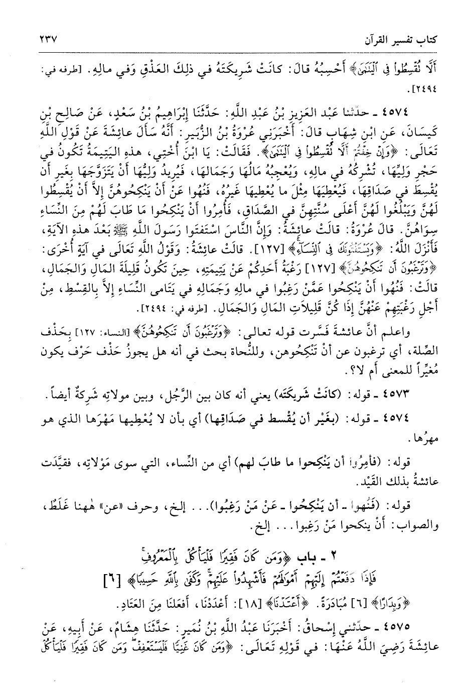 4574 - حَدَّثَنَا عَبْدُ الْعَزِيزِ بْنُ عَبْدِ اللَّهِ حَدَّثَنَا إِبْرَاهِيمُ بْنُ سَعْدٍ عَنْ صَالِحِ بْنِ كَيْسَانَ عَنِ ابْنِ شِهَابٍ قَالَ أَخْبَرَنِى عُرْوَةُ بْنُ الزُّبَيْرِ أَنَّهُ سَأَلَ عَائِشَةَ عَنْ قَوْلِ اللَّهِ تَعَالَى {وَإِنْ خِفْتُمْ أَلَّا تُقْسِطُوا فِي الْيَتَامَى}. فَقَالَتْ يَا ابْنَ أُخْتِى، هَذِهِ الْيَتِيمَةُ تَكُونُ فِى حَجْرِ وَلِيِّهَا، تَشْرَكُهُ فِى مَالِهِ وَيُعْجِبُهُ مَالُهَا وَجَمَالُهَا، فَيُرِيدُ وَلِيُّهَا أَنْ يَتَزَوَّجَهَا، بِغَيْرِ أَنْ يُقْسِطَ فِى صَدَاقِهَا، فَيُعْطِيَهَا مِثْلَ مَا يُعْطِيهَا غَيْرُهُ، فَنُهُوا عَنْ أَنْ يَنْكِحُوهُنَّ، إِلاَّ أَنْ يُقْسِطُوا لَهُنَّ، وَيَبْلُغُوا لَهُنَّ أَعْلَى سُنَّتِهِنَّ فِى الصَّدَاقِ، فَأُمِرُوا أَنْ يَنْكِحُوا مَا طَابَ لَهُمْ مِنَ النِّسَاءِ سِوَاهُنَّ. قَالَ عُرْوَةُ قَالَتْ عَائِشَةُ وَإِنَّ النَّاسَ اسْتَفْتَوْا رَسُولَ اللَّهِ - صلى الله عليه وسلم - بَعْدَ هَذِهِ الآيَةِ فَأَنْزَلَ اللَّهُ {وَيَسْتَفْتُونَكَ فِي النِّسَاءِ} [النساء: 127] قَالَتْ عَائِشَةُ وَقَوْلُ اللَّهِ تَعَالَى فِى آيَةٍ أُخْرَى {وَتَرْغَبُونَ أَنْ تَنْكِحُوهُنَّ} [النساء: 127] رَغْبَةُ أَحَدِكُمْ عَنْ يَتِيمَتِهِ حِينَ تَكُونُ قَلِيلَةَ الْمَالِ وَالْجَمَالِ قَالَتْ فَنُهُوا أَنْ يَنْكِحُوا عَنْ مَنْ رَغِبُوا فِى مَالِهِ وَجَمَالِهِ فِى يَتَامَى النِّسَاءِ، إِلاَّ بِالْقِسْطِ، مِنْ أَجْلِ رَغْبَتِهِمْ عَنْهُنَّ إِذَا كُنَّ قَلِيلاَتِ الْمَالِ وَالْجَمَالِ. أطرافه 2494، 2763، 4573، 4600، 5064، 5092، 5098، 5128، 5131، 5140، 6965 - تحفة 16493 - 54/ 6