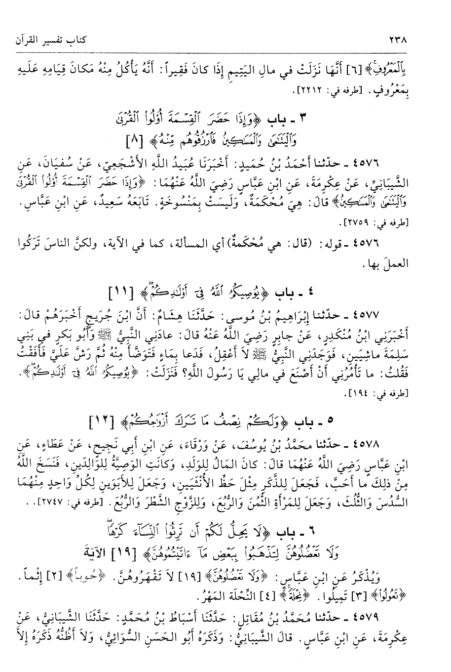 4576 - حَدَّثَنَا أَحْمَدُ بْنُ حُمَيْدٍ أَخْبَرَنَا عُبَيْدُ اللَّهِ الأَشْجَعِىُّ عَنْ سُفْيَانَ عَنِ الشَّيْبَانِىِّ عَنْ عِكْرِمَةَ عَنِ ابْنِ عَبَّاسٍ - رضى الله عنهما - {وَإِذَا حَضَرَ الْقِسْمَةَ أُولُو الْقُرْبَى وَالْيَتَامَى وَالْمَسَاكِينُ} قَالَ هِىَ مُحْكَمَةٌ وَلَيْسَتْ بِمَنْسُوخَةٍ. تَابَعَهُ سَعِيدٌ عَنِ ابْنِ عَبَّاسٍ. طرفه 2759 - تحفة 6102