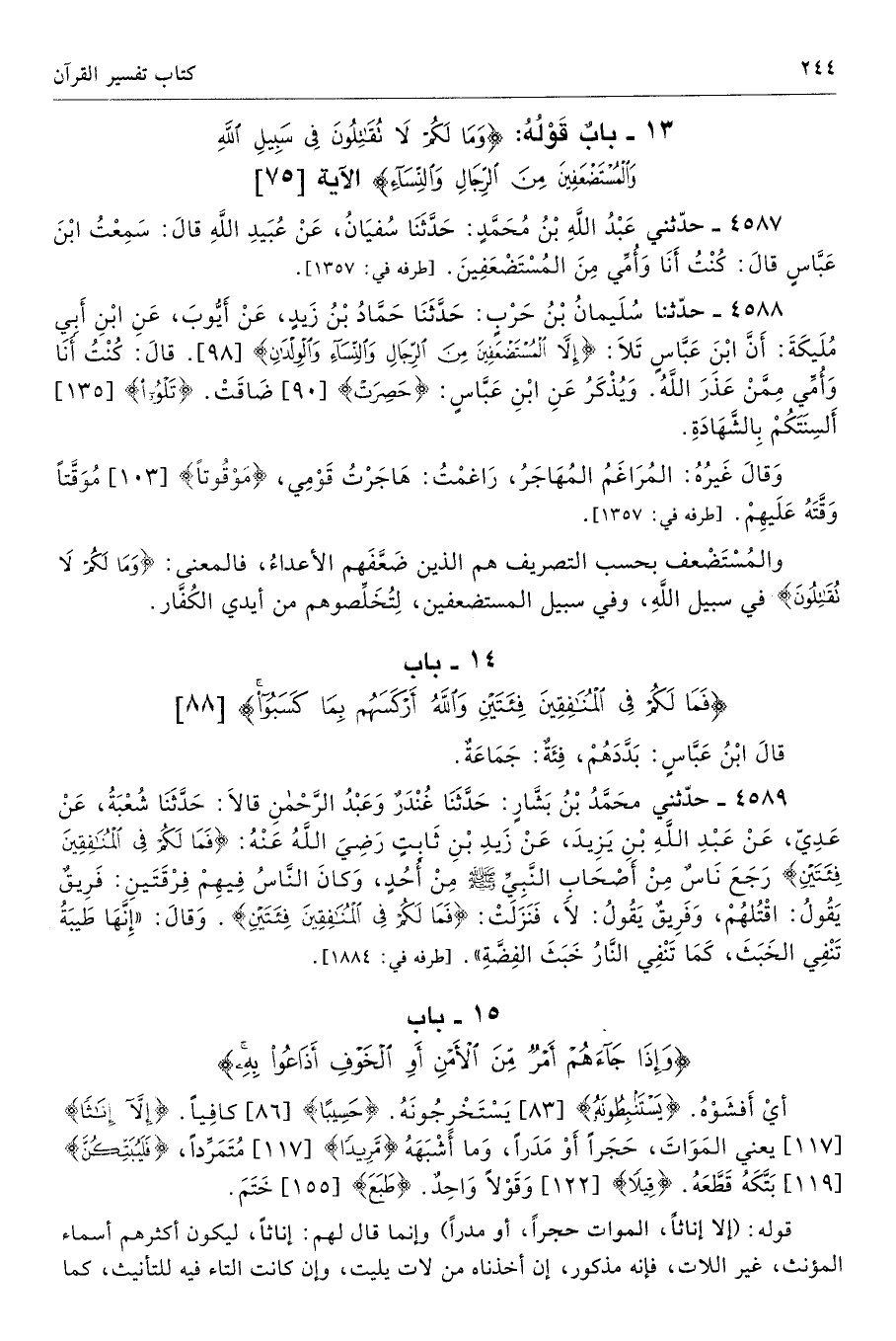 4587 - حَدَّثَنِى عَبْدُ اللَّهِ بْنُ مُحَمَّدٍ حَدَّثَنَا سُفْيَانُ عَنْ عُبَيْدِ اللَّهِ قَالَ سَمِعْتُ ابْنَ عَبَّاسٍ قَالَ كُنْتُ أَنَا وَأُمِّى مِنَ الْمُسْتَضْعَفِينَ. أطرافه 1357، 4588، 4597 - تحفة 5864، 5868 أ