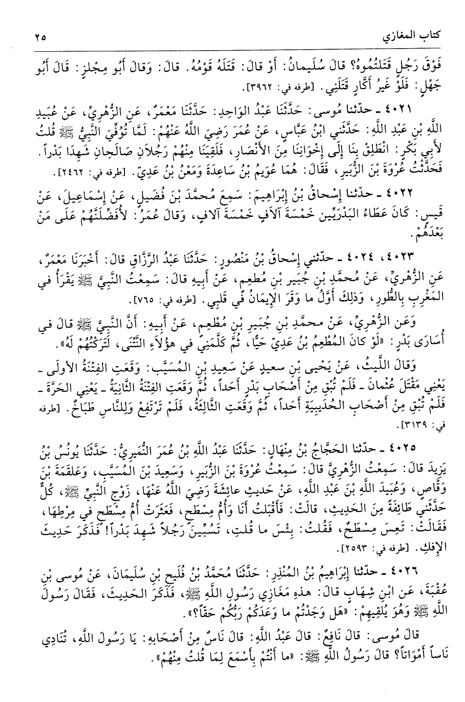 4026 - حَدَّثَنَا إِبْرَاهِيمُ بْنُ الْمُنْذِرِ حَدَّثَنَا مُحَمَّدُ بْنُ فُلَيْحِ بْنِ سُلَيْمَانَ عَنْ مُوسَى بْنِ عُقْبَةَ عَنِ ابْنِ شِهَابٍ قَالَ هَذِهِ مَغَازِى رَسُولِ اللَّهِ - صلى الله عليه وسلم -. فَذَكَرَ الْحَدِيثَ، فَقَالَ رَسُولُ اللَّهِ - صلى الله عليه وسلم - وَهْوَ يُلْقِيهِمْ «هَلْ وَجَدْتُمْ مَا وَعَدَكُمْ رَبُّكُمْ حَقًّا».