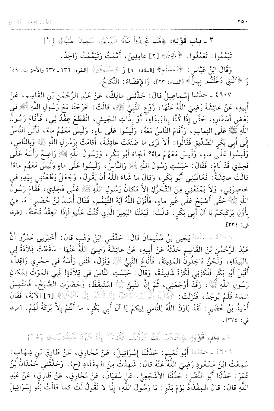 4607 - حَدَّثَنَا إِسْمَاعِيلُ قَالَ حَدَّثَنِى مَالِكٌ عَنْ عَبْدِ الرَّحْمَنِ بْنِ الْقَاسِمِ عَنْ أَبِيهِ عَنْ عَائِشَةَ - رضى الله عنها - زَوْجِ النَّبِىِّ - صلى الله عليه وسلم - قَالَتْ خَرَجْنَا مَعَ رَسُولِ اللَّهِ - صلى الله عليه وسلم - فِى بَعْضِ أَسْفَارِهِ، حَتَّى إِذَا كُنَّا بِالْبَيْدَاءِ أَوْ بِذَاتِ الْجَيْشِ انْقَطَعَ عِقْدٌ لِى، فَأَقَامَ رَسُولُ اللَّهِ - صلى الله عليه وسلم - عَلَى الْتِمَاسِهِ، وَأَقَامَ النَّاسُ مَعَهُ، وَلَيْسُوا عَلَى مَاءٍ، وَلَيْسَ مَعَهُمْ مَاءٌ فَأَتَى النَّاسُ إِلَى أَبِى بَكْرٍ الصِّدِّيقِ فَقَالُوا أَلاَ تَرَى مَا صَنَعَتْ عَائِشَةُ أَقَامَتْ بِرَسُولِ اللَّهِ - صلى الله عليه وسلم - وَبِالنَّاسِ، وَلَيْسُوا عَلَى مَاءٍ، وَلَيْسَ مَعَهُمْ مَاءٌ، فَجَاءَ أَبُو بَكْرٍ وَرَسُولُ اللَّهِ - صلى الله عليه وسلم - وَاضِعٌ رَأْسَهُ عَلَى فَخِذِى قَدْ نَامَ، فَقَالَ حَبَسْتِ رَسُولَ اللَّهِ - صلى الله عليه وسلم - وَالنَّاسَ، وَلَيْسُوا عَلَى مَاءٍ، وَلَيْسَ مَعَهُمْ مَاءٌ قَالَتْ عَائِشَةُ فَعَاتَبَنِى أَبُو بَكْرٍ، وَقَالَ مَا شَاءَ اللَّهُ أَنْ يَقُولَ، وَجَعَلَ يَطْعُنُنِى بِيَدِهِ فِى خَاصِرَتِى، وَلاَ يَمْنَعُنِى مِنَ التَّحَرُّكِ إِلاَّ مَكَانُ رَسُولِ اللَّهِ - صلى الله عليه وسلم - عَلَى فَخِذِى، فَقَامَ رَسُولُ اللَّهِ - صلى الله عليه وسلم - حَتَّى أَصْبَحَ عَلَى غَيْرِ مَاءٍ، فَأَنْزَلَ اللَّهُ آيَةَ التَّيَمُّمِ فَقَالَ أُسَيْدُ بْنُ حُضَيْرٍ مَا هِىَ بِأَوَّلِ بَرَكَتِكُمْ يَا آلَ أَبِى بَكْرٍ. قَالَتْ فَبَعَثْنَا الْبَعِيرَ الَّذِى كُنْتُ عَلَيْهِ فَإِذَا الْعِقْدُ تَحْتَهُ. أطرافه 334، 336، 3672، 3773، 4583، 4608، 5164، 5250، 5882، 6844، 6845 - تحفة 17519 - 64/ 6