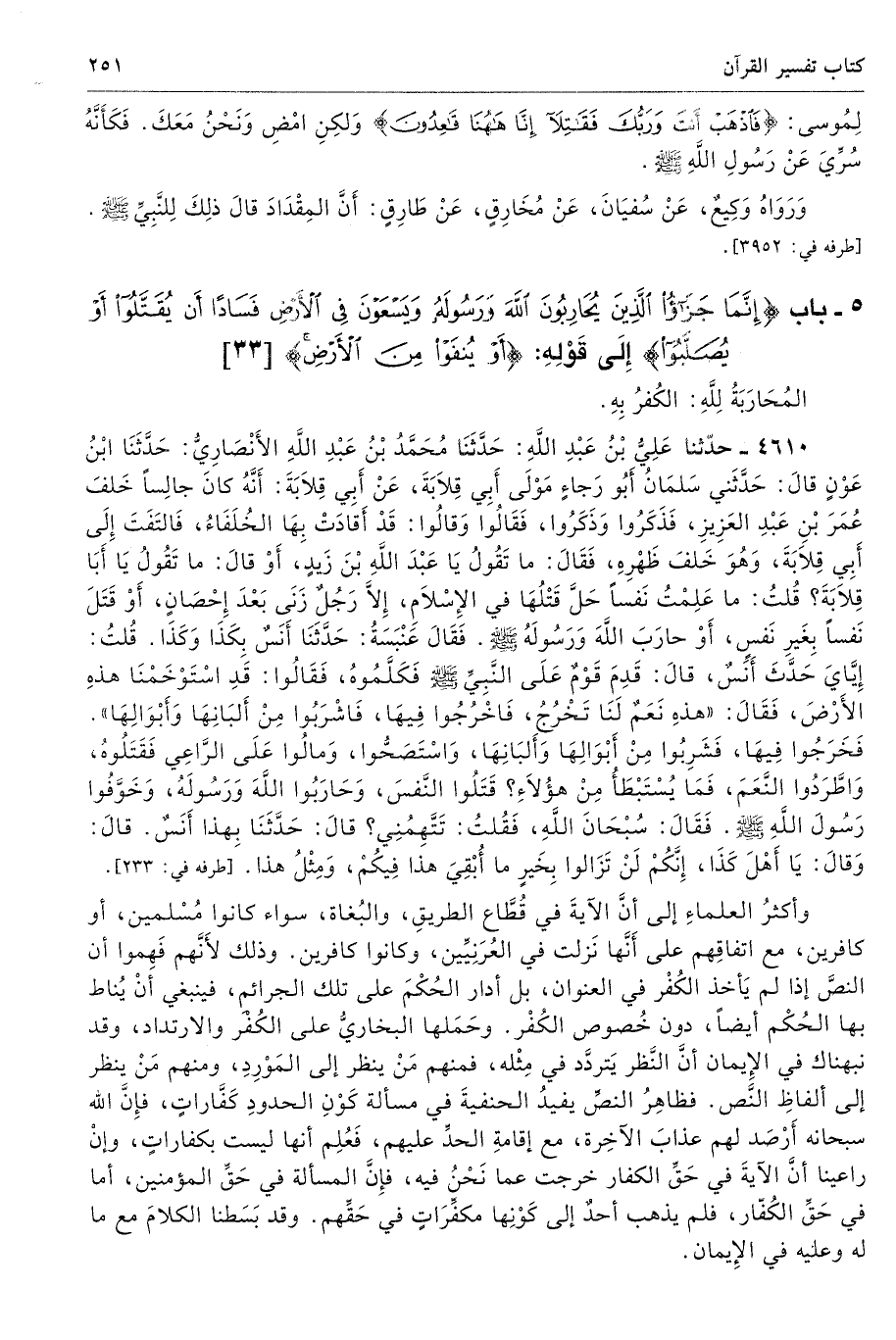 4610 - حَدَّثَنَا عَلِىُّ بْنُ عَبْدِ اللَّهِ حَدَّثَنَا مُحَمَّدُ بْنُ عَبْدِ اللَّهِ الأَنْصَارِىُّ حَدَّثَنَا ابْنُ عَوْنٍ قَالَ حَدَّثَنِى سَلْمَانُ أَبُو رَجَاءٍ مَوْلَى أَبِى قِلاَبَةَ عَنْ أَبِى قِلاَبَةَ أَنَّهُ كَانَ جَالِسًا خَلْفَ عُمَرَ بْنِ عَبْدِ الْعَزِيزِ، فَذَكَرُوا وَذَكَرُوا فَقَالُوا وَقَالُوا قَدْ أَقَادَتْ بِهَا الْخُلَفَاءُ، فَالْتَفَتَ إِلَى أَبِى قِلاَبَةَ وَهْوَ خَلْفَ ظَهْرِهِ، فَقَالَ مَا تَقُولُ يَا عَبْدَ اللَّهِ بْنَ زَيْدٍ أَوْ قَالَ مَا تَقُولُ يَا أَبَا قِلاَبَةَ قُلْتُ مَا عَلِمْتُ نَفْسًا حَلَّ قَتْلُهَا فِى الإِسْلاَمِ إِلاَّ رَجُلٌ زَنَى بَعْدَ إِحْصَانٍ، أَوْ قَتَلَ نَفْسًا بِغَيْرِ نَفْسٍ، أَوْ حَارَبَ اللَّهَ وَرَسُولَهُ - صلى الله عليه وسلم -. فَقَالَ عَنْبَسَةُ حَدَّثَنَا أَنَسٌ بِكَذَا وَكَذَا. قُلْتُ إِيَّاىَ حَدَّثَ أَنَسٌ قَالَ قَدِمَ قَوْمٌ عَلَى النَّبِىِّ - صلى الله عليه وسلم - فَكَلَّمُوهُ فَقَالُوا قَدِ اسْتَوْخَمْنَا هَذِهِ الأَرْضَ. فَقَالَ «هَذِهِ نَعَمٌ لَنَا تَخْرُجُ، فَاخْرُجُوا فِيهَا، فَاشْرَبُوا مِنْ أَلْبَانِهَا وَأَبْوَالِهَا». فَخَرَجُوا فِيهَا فَشَرِبُوا مِنْ أَبْوَالِهَا وَأَلْبَانِهَا وَاسْتَصَحُّوا، وَمَالُوا عَلَى الرَّاعِى فَقَتَلُوهُ، وَاطَّرَدُوا النَّعَمَ، فَمَا يُسْتَبْطَأُ مِنْ هَؤُلاَءِ قَتَلُوا النَّفْسَ وَحَارَبُوا اللَّهَ وَرَسُولَهُ، وَخَوَّفُوا رَسُولَ اللَّهِ - صلى الله عليه وسلم -. فَقَالَ سُبْحَانَ اللَّهِ. فَقُلْتُ تَتَّهِمُنِى قَالَ حَدَّثَنَا بِهَذَا أَنَسٌ. قَالَ وَقَالَ يَا أَهْلَ كَذَا إِنَّكُمْ لَنْ تَزَالُوا بِخَيْرٍ مَا أُبْقِىَ هَذَا فِيكُمْ أَوْ مِثْلُ هَذَا. أطرافه 233، 1501، 3018، 4192، 4193، 5685، 5686، 5727، 6802، 6803، 6804، 6805، 6899 - تحفة 945