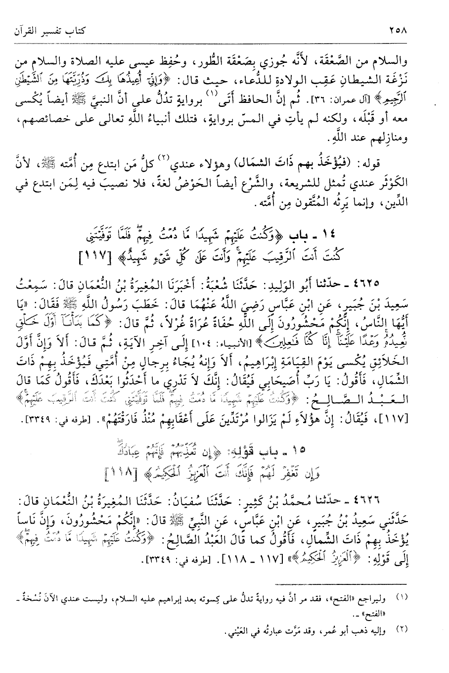 4626 - حَدَّثَنَا مُحَمَّدُ بْنُ كَثِيرٍ حَدَّثَنَا سُفْيَانُ حَدَّثَنَا الْمُغِيرَةُ بْنُ النُّعْمَانِ قَالَ حَدَّثَنِى سَعِيدُ بْنُ جُبَيْرٍ عَنِ ابْنِ عَبَّاسٍ عَنِ النَّبِىِّ - صلى الله عليه وسلم - قَالَ «إِنَّكُمْ مَحْشُورُونَ، وَإِنَّ نَاسًا يُؤْخَذُ بِهِمْ ذَاتَ الشِّمَالِ، فَأَقُولُ كَمَا قَالَ الْعَبْدُ الصَّالِحُ {وَكُنْتُ عَلَيْهِمْ شَهِيدًا مَا دُمْتُ فِيهِمْ} إِلَى قَوْلِهِ {الْعَزِيزُ الْحَكِيمُ} [المائدة: 117 - 118]. أطرافه 3349، 3447، 4625، 4740، 6524، 6525، 6526 - تحفة 5622