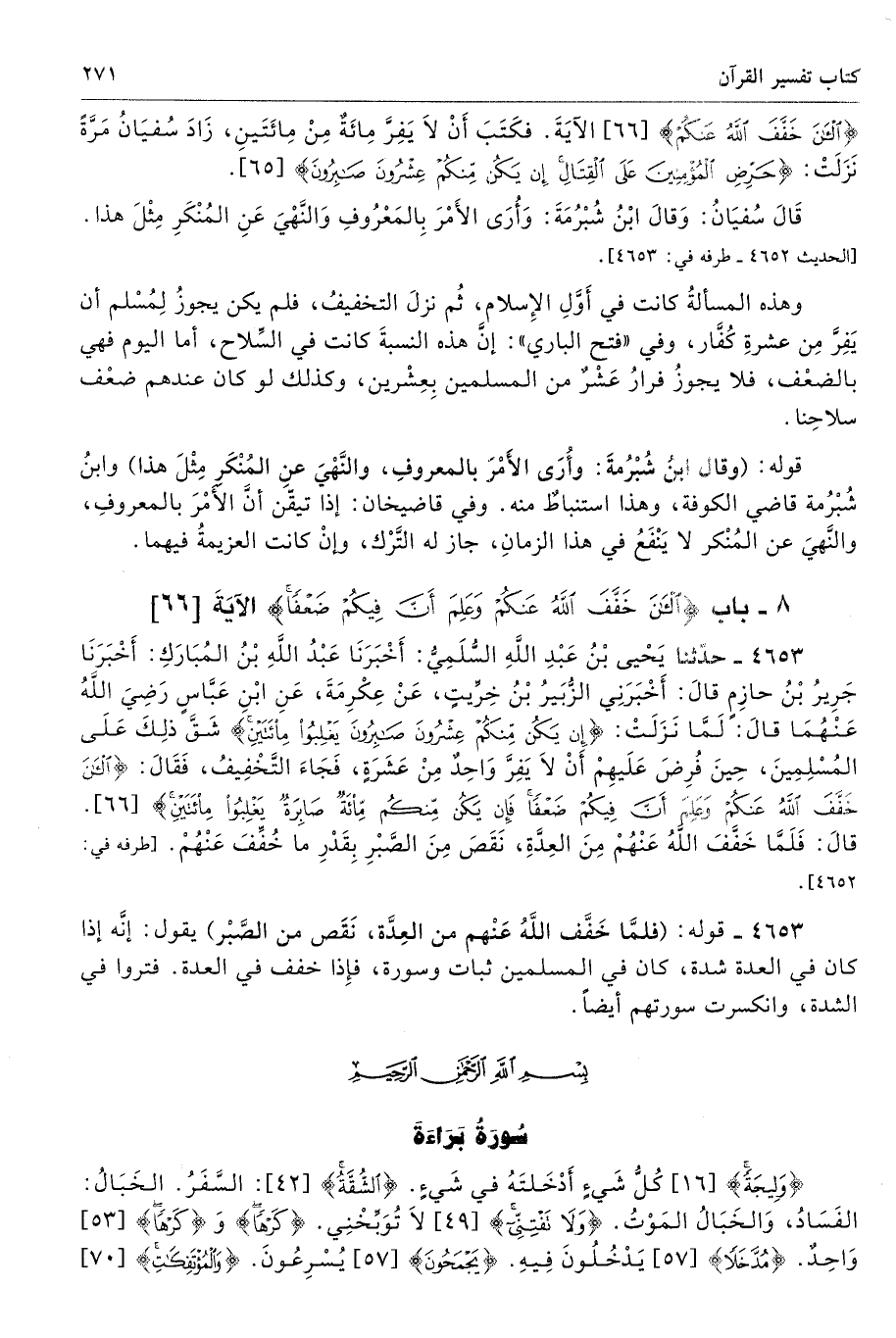{الْآنَ خَفَّفَ اللَّهُ عَنْكُمْ} [الأنفال: 66] الآيَةَ، فَكَتَبَ أَنْ لاَ يَفِرَّ مِائَةٌ مِنْ مِائَتَيْنِ - زَادَ سُفْيَانُ مَرَّةً - نَزَلَتْ {حَرِّضِ الْمُؤْمِنِينَ عَلَى الْقِتَالِ إِنْ يَكُنْ مِنْكُمْ عِشْرُونَ صَابِرُونَ} [الأنفال: 65].