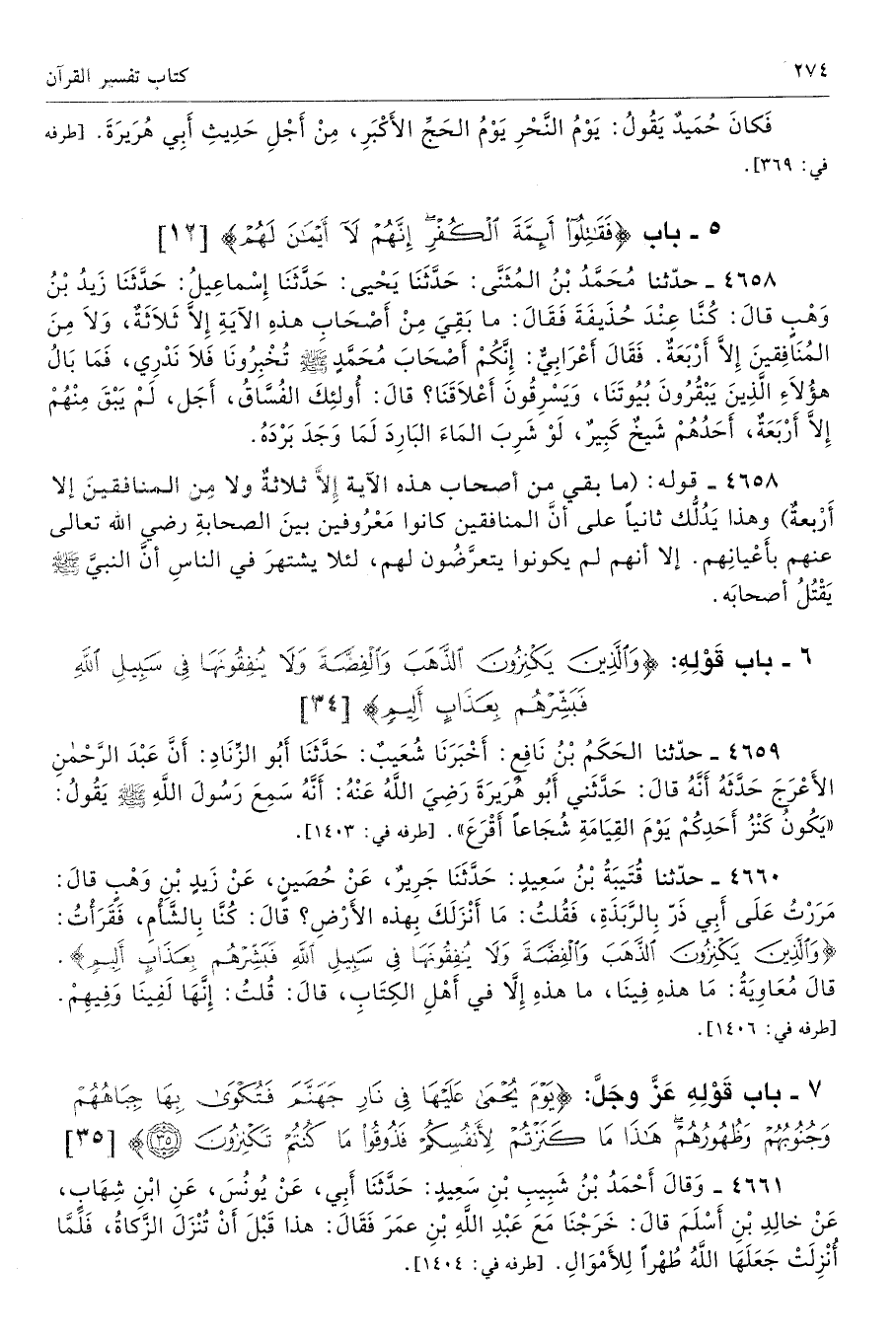 4660 - حَدَّثَنَا قُتَيْبَةُ بْنُ سَعِيدٍ حَدَّثَنَا جَرِيرٌ عَنْ حُصَيْنٍ عَنْ زَيْدِ بْنِ وَهْبٍ قَالَ مَرَرْتُ عَلَى أَبِى ذَرٍّ بِالرَّبَذَةِ فَقُلْتُ مَا أَنْزَلَكَ بِهَذِهِ الأَرْضِ قَالَ كُنَّا بِالشَّأْمِ فَقَرَأْتُ {وَالَّذِينَ يَكْنِزُونَ الذَّهَبَ وَالْفِضَّةَ وَلَا يُنْفِقُونَهَا فِي سَبِيلِ اللَّهِ فَبَشِّرْهُمْ بِعَذَابٍ أَلِيمٍ} [التوبة: 34] قَالَ مُعَاوِيَةُ مَا هَذِهِ فِينَا، مَا هَذِهِ إِلاَّ فِى أَهْلِ الْكِتَابِ. قَالَ قُلْتُ إِنَّهَا لَفِينَا وَفِيهِمْ. طرفه 1406 - تحفة 11916