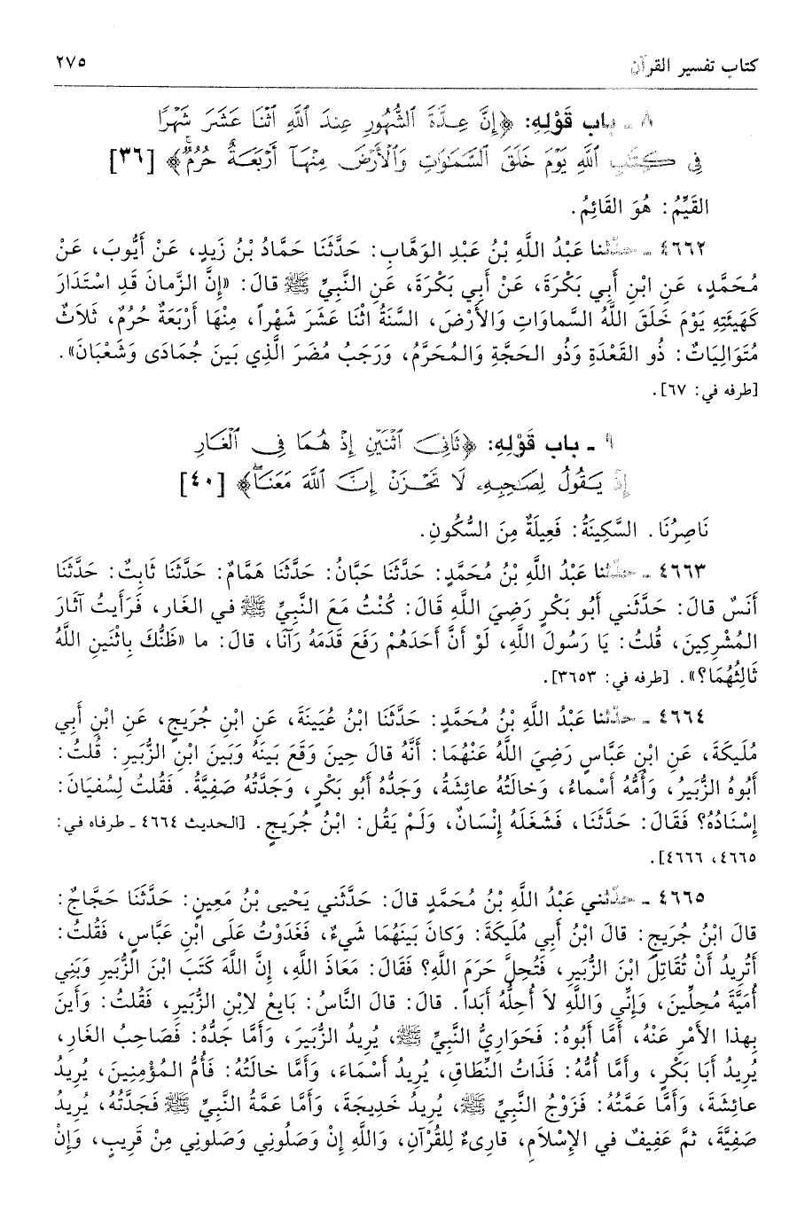 4662 - حَدَّثَنَا عَبْدُ اللَّهِ بْنُ عَبْدِ الْوَهَّابِ حَدَّثَنَا حَمَّادُ بْنُ زَيْدٍ عَنْ أَيُّوبَ عَنْ مُحَمَّدٍ عَنِ ابْنِ أَبِى بَكْرَةَ عَنْ أَبِى بَكْرَةَ عَنِ النَّبِىِّ - صلى الله عليه وسلم - قَالَ «إِنَّ الزَّمَانَ قَدِ اسْتَدَارَ كَهَيْئَتِهِ يَوْمَ خَلَقَ اللَّهُ السَّمَوَاتِ وَالأَرْضَ، السَّنَةُ اثْنَا عَشَرَ شَهْرًا مِنْهَا، أَرْبَعَةٌ حُرُمٌ، ثَلاَثٌ مُتَوَالِيَاتٌ، ذُو الْقَعْدَةِ وَذُو الْحِجَّةِ وَالْمُحَرَّمُ وَرَجَبُ مُضَرَ الَّذِى بَيْنَ جُمَادَى وَشَعْبَانَ». أطرافه 67، 105، 1741، 3197، 4406، 5550، 7078، 7447 - تحفة 11682