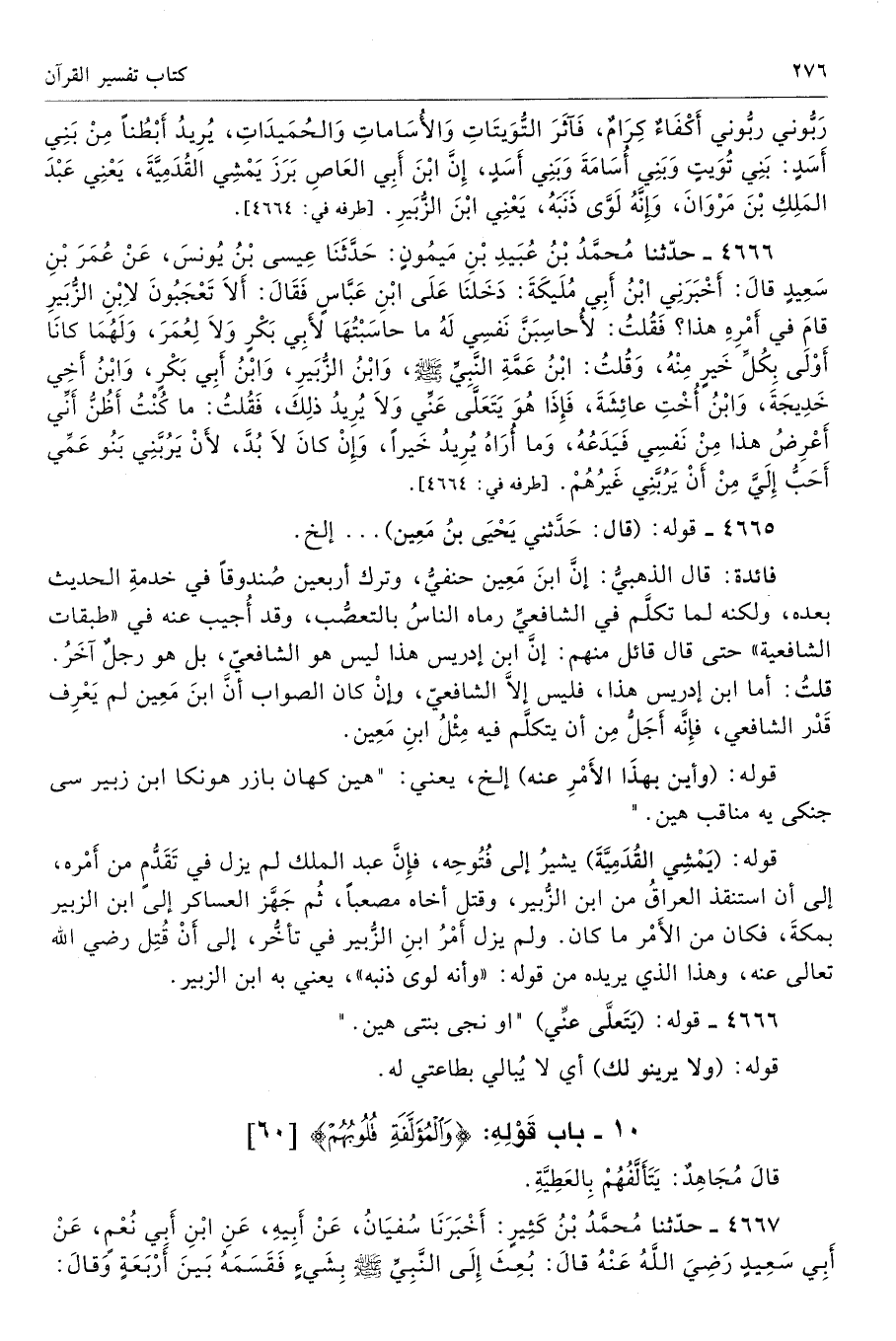 رَبُّونِى رَبَّنِى أَكْفَاءٌ كِرَامٌ، فَآثَرَ التُّوَيْتَاتِ وَالأُسَامَاتِ وَالْحُمَيْدَاتِ، يُرِيدُ أَبْطُنًا مِنْ بَنِى أَسَدٍ بَنِى تُوَيْتٍ وَبَنِى أُسَامَةَ وَبَنِى أَسَدٍ، إِنَّ ابْنَ أَبِى الْعَاصِ بَرَزَ يَمْشِى الْقُدَمِيَّةَ، يَعْنِى عَبْدَ الْمَلِكِ بْنَ مَرْوَانَ، وَإِنَّهُ لَوَّى ذَنَبَهُ، يَعْنِى ابْنَ الزُّبَيْرِ. طرفاه 4664، 4666 - تحفة 5799 - 84/ 6