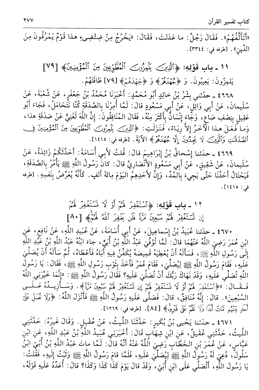 4668 - حَدَّثَنِى بِشْرُ بْنُ خَالِدٍ أَبُو مُحَمَّدٍ أَخْبَرَنَا مُحَمَّدُ بْنُ جَعْفَرٍ عَنْ شُعْبَةَ عَنْ سُلَيْمَانَ عَنْ أَبِى وَائِلٍ عَنْ أَبِى مَسْعُودٍ قَالَ لَمَّا أُمِرْنَا بِالصَّدَقَةِ كُنَّا نَتَحَامَلُ فَجَاءَ أَبُو عَقِيلٍ بِنِصْفِ صَاعٍ، وَجَاءَ إِنْسَانٌ بِأَكْثَرَ مِنْهُ، فَقَالَ الْمُنَافِقُونَ إِنَّ اللَّهَ لَغَنِىٌّ عَنْ صَدَقَةِ هَذَا، وَمَا فَعَلَ هَذَا الآخَرُ إِلاَّ رِئَاءً. فَنَزَلَتْ {الَّذِينَ يَلْمِزُونَ الْمُطَّوِّعِينَ مِنَ الْمُؤْمِنِينَ فِي الصَّدَقَاتِ وَالَّذِينَ لَا يَجِدُونَ إِلَّا جُهْدَهُمْ} الآيَةَ. أطرافه 1415، 1416، 2273، 4669 - تحفة 9991
