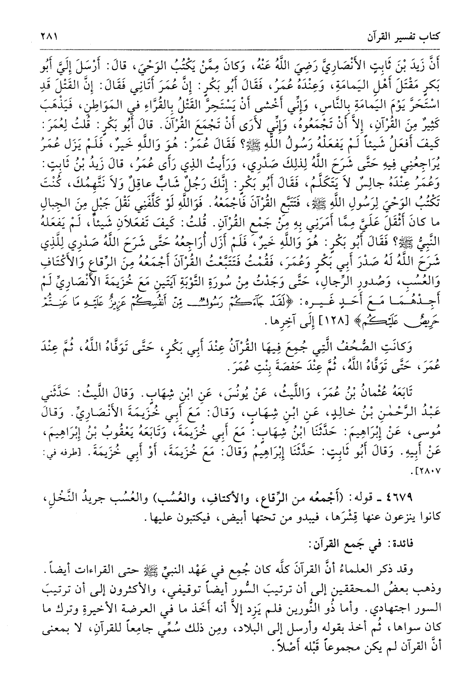 أَنَّ زَيْدَ بْنَ ثَابِتٍ الأَنْصَارِىَّ - رضى الله عنه - وَكَانَ مِمَّنْ يَكْتُبُ الْوَحْىَ قَالَ أَرْسَلَ إِلَىَّ أَبُو بَكْرٍ مَقْتَلَ أَهْلِ الْيَمَامَةِ وَعِنْدَهُ عُمَرُ، فَقَالَ أَبُو بَكْرٍ إِنَّ عُمَرَ أَتَانِى فَقَالَ إِنَّ الْقَتْلَ قَدِ اسْتَحَرَّ يَوْمَ الْيَمَامَةِ بِالنَّاسِ، وَإِنِّى أَخْشَى أَنْ يَسْتَحِرَّ الْقَتْلُ بِالْقُرَّاءِ فِى الْمَوَاطِنِ فَيَذْهَبَ كَثِيرٌ مِنَ الْقُرْآنِ، إِلاَّ أَنْ تَجْمَعُوهُ، وَإِنِّى لأَرَى أَنْ تَجْمَعَ الْقُرْآنَ. قَالَ أَبُو بَكْرٍ قُلْتُ لِعُمَرَ كَيْفَ أَفْعَلُ شَيْئًا لَمْ يَفْعَلْهُ رَسُولُ اللَّهِ - صلى الله عليه وسلم - فَقَالَ عُمَرُ هُوَ وَاللَّهِ خَيْرٌ. فَلَمْ يَزَلْ عُمَرُ يُرَاجِعُنِى فِيهِ حَتَّى شَرَحَ اللَّهُ لِذَلِكَ صَدْرِى، وَرَأَيْتُ الَّذِى رَأَى عُمَرُ. قَالَ زَيْدُ بْنُ ثَابِتٍ وَعُمَرُ عِنْدَهُ جَالِسٌ لاَ يَتَكَلَّمُ. فَقَالَ أَبُو بَكْرٍ إِنَّكَ رَجُلٌ شَابٌّ عَاقِلٌ وَلاَ نَتَّهِمُكَ، كُنْتَ تَكْتُبُ الْوَحْىَ لِرَسُولِ اللَّهِ - صلى الله عليه وسلم - فَتَتَبَّعِ الْقُرْآنَ فَاجْمَعْهُ. فَوَاللَّهِ لَوْ كَلَّفَنِى نَقْلَ جَبَلٍ مِنَ الْجِبَالِ مَا كَانَ أَثْقَلَ عَلَىَّ مِمَّا أَمَرَنِى بِهِ مِنْ جَمْعِ الْقُرْآنِ قُلْتُ كَيْفَ تَفْعَلاَنِ شَيْئًا لَمْ يَفْعَلْهُ النَّبِىُّ - صلى الله عليه وسلم - فَقَالَ أَبُو بَكْرٍ هُوَ وَاللَّهِ خَيْرٌ، فَلَمْ أَزَلْ أُرَاجِعُهُ حَتَّى شَرَحَ اللَّهُ صَدْرِى لِلَّذِى شَرَحَ اللَّهُ لَهُ صَدْرَ أَبِى بَكْرٍ وَعُمَرَ، فَقُمْتُ فَتَتَبَّعْتُ الْقُرْآنَ أَجْمَعُهُ مِنَ الرِّقَاعِ وَالأَكْتَافِ وَالْعُسُبِ وَصُدُورِ الرِّجَالِ، حَتَّى وَجَدْتُ مِنْ سُورَةِ التَّوْبَةِ آيَتَيْنِ مَعَ خُزَيْمَةَ الأَنْصَارِىِّ، لَمْ أَجِدْهُمَا مَعَ أَحَدٍ غَيْرِهِ {لَقَدْ جَاءَكُمْ رَسُولٌ مِنْ أَنْفُسِكُمْ عَزِيزٌ عَلَيْهِ مَا عَنِتُّمْ حَرِيصٌ عَلَيْكُمْ} [التوبة: 128] إِلَى آخِرِهِمَا.