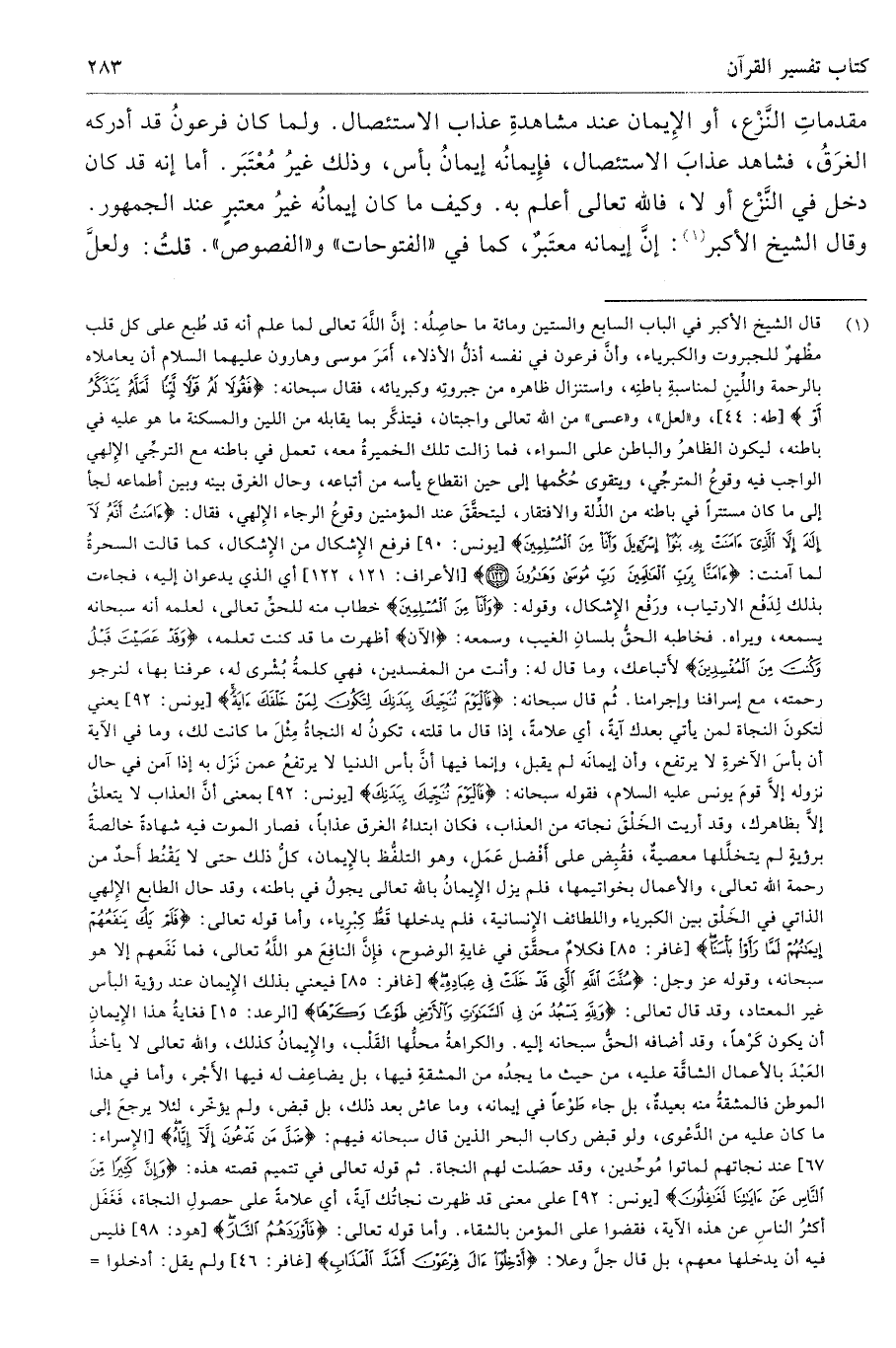 (¬1) قال الشيخ الأكبر في الباب السابع والستين ومائة ما حاصِلُه: إن اللهَ تعالى لما علم أنه قد طُبع على كل قلب مظْهرٌ للجبروت والكبرياء، وأن فرعون في نفسه أذلُّ الأذلاء، أمَرَ موسى وهارون عليهما السلام أن يعاملاه بالرحمة واللِّينِ لمناسبةِ باطنِه، واستنزال ظاهره من جبروتِه وكبريائه، فقال سبحانه: {فَقُولَا لَهُ قَوْلًا لَيِّنًا لَعَلَّهُ يَتَذَكَّرُ أَوْ} [طه: 44]، و"لعل "، و"عسى" من الله تعالى واجبتان، فيتذكَّر بما يقابله من اللين والمسكنة ما هو عليه في باطنه، ليكون الظاهرُ والباطن على السواء، فما زالت تلك الخميرةُ معه، تعمل في باطنه مع الترجِّي الإِلهي الواجب فيه وقوعُ المترجِّي، ويتقوى حُكْمها إلى حين انقطاع يأسه من أتباعه، وحال الغرق بينه وبين أطماعه لجأ إلى ما كان مستترًا في باطنه من الذِّلة والافتقار، ليتحقَّقَ عند المؤمنين وقوعُ الرجاء الإِلهي، فقال: {آمَنْتُ أَنَّهُ لَا إِلَهَ إِلَّا الَّذِي آمَنَتْ بِهِ بَنُو إِسْرَائِيلَ وَأَنَا مِنَ الْمُسْلِمِينَ} [يونس: 90] فرفع الإِشكال من الإِشكال، كما قالت السحرةُ لما آمنت: {آمَنَّا بِرَبِّ الْعَالَمِينَ (121) رَبِّ مُوسَى وَهَارُونَ (122)} [الأعراف: 121 - 122] أي الذي يدعوان إليه، فجاءت بذلك لِدَفْع الارتياب، ورَفْع الإِشكال، وقوله: {وَأَنَا مِنَ الْمُسْلِمِينَ} خطاب منه للحقِّ تعالى، لعلمه أنه سبحانه يسمعه، ويراه. فخاطبه الحقُّ بلسانِ الغيب، وسمعه: {آلْآنَ} أظهرت ما قد كنت تعلمه، {وَقَدْ عَصَيْتَ قَبْلُ وَكُنْتَ مِنَ الْمُفْسِدِينَ} لأَتباعك، وما قال له: وأنت من المفسدين، فهي كلمةُ بُشْرى له، عرفنا بها، لنرجو رحمته، مع إسرافنا وإجرامنا. ثُم قال سبحانه: {فَالْيَوْمَ نُنَجِّيكَ بِبَدَنِكَ لِتَكُونَ لِمَنْ خَلْفَكَ آيَةً} [يونس: 92] يعني لتكونَ النجاة لمن يأتي بعدك آيةٌ، أي علامةً، إذا قال ما قلته، تكونُ له النجاةُ مِثْلَ ما كانت لك، وما في الآية أن بأسَ الآخرةِ لا يرتفع، وأن إيمانَه لم يقبل، وإنما فيها أنَّ بأس الدنيا لا يرتفعُ عمن نَزَل به إذا آمن في حال نزوله إلَّا قومَ يونس عليه السلام، فقوله سبحانه: {فَالْيَوْمَ نُنَجِّيكَ بِبَدَنِكَ} [يونس: 92] بمعنى أن العذاب لا يتعلق إلَّا بظاهرك، وقد أريت الخَلْقَ نجاته من العذاب، فكان ابتداءُ الغرق عذابًا، فصار الموت فيه شهادةً خالصة برؤيةٍ لم يتخلَّلها معصيةٌ، فقُبِض على أَفْضل عَمَل، وهو التلفُّظ بالإِيمان، كلُّ ذلك حتى لا يَقْنُط أَحدٌ من رحمة الله تعالى، والأعمال بخواتيمها، فلم يزل الإِيمانُ بالله تعالى يجولُ في باطنه، وقد حال الطابع الإِلهي الذاتي في الخَلْق بين الكبرياء واللطائف الإِنسانية، فلم يدخلها قَطُّ كِبْرِياء، وأما قوله تعالى: {فَلَمْ يَكُ يَنْفَعُهُمْ إِيمَانُهُمْ لَمَّا رَأَوْا بَأْسَنَا} [غافر: 85] فكلامُ محقَّق في غايةِ الوضوح، فإِن النافِعَ هو اللهُ تعالى، فما نَفَعهم إلا هو سبحانه، وقوله عز وجل: {سُنَّتَ اللَّهِ الَّتِي قَدْ خَلَتْ فِي عِبَادِهِ} [غافر: 85] فيعني بذلك الإِيمان عند رؤية البأس غير المعتاد، وقد قال تعالى: {وَلِلَّهِ يَسْجُدُ مَنْ فِي السَّمَاوَاتِ وَالْأَرْضِ طَوْعًا وَكَرْهًا} [الرعد: 15] فغايةُ هذا الإِيمانِ أن يكون كَرْهًا، وقد أضافه الحقُّ سبحانه إليه. والكراهةُ محلُّها القَلْب، والإِيمانُ كذلك، والله تعالى لا يأخذُّ العَبْدَ بالأعمال الشاقَّة عليه، من حيث ما يجدُه من المشقةِ فيها، بل يضاعِف له فيها الأَجْر، وأما في هذا الموطن فالمشقةُ منه بعيدةٌ، بل جاء طَوْعًا في إيمانه، وما عاش بعد ذلك، بل قبض، ولم يؤخر، لئلا يرجعَ إلى ما كان عليه من الدَّعْوى، ولو قبض ركاب البحر الذين قال سبحانه فيهم: {ضَلَّ مَنْ تَدْعُونَ إِلَّا إِيَّاهُ} [الإسراء: 67] عند نجاتهم لماتوا مُوحِّدين، وقد حصَلت لهم النجاة. ثم قوله تعالى في تتميم قصته هذه: {وَإِنَّ كَثِيرًا مِنَ النَّاسِ عَنْ آيَاتِنَا لَغَافِلُونَ} [يونس: 92] على معنى قد ظهرت نجاتُك آية، أي علامة على ح