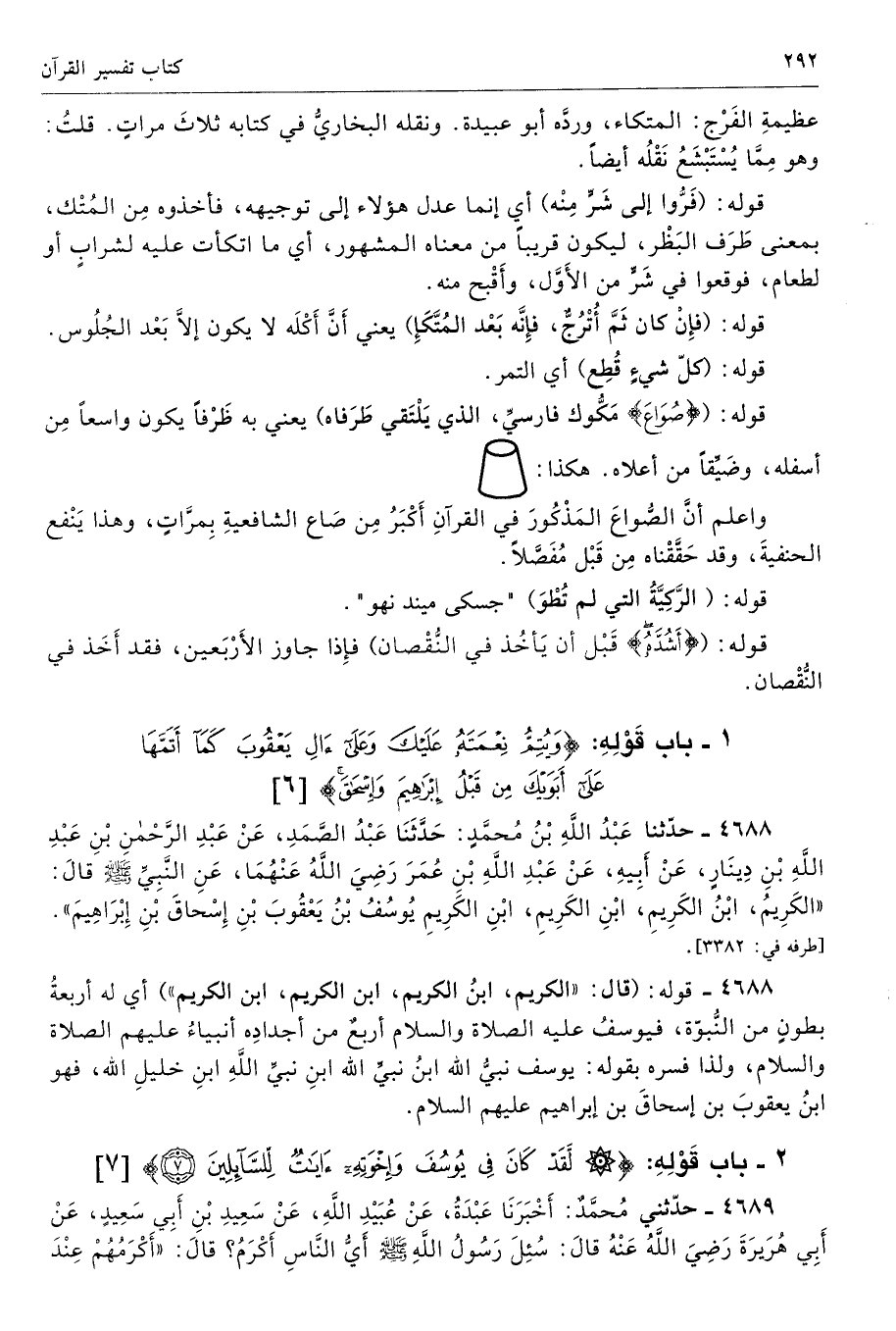 واعلم أنَّ الصُّواعَ المَذْكُورَ في القرآنِ أَكْبَرُ مِن صَاع الشافعيةِ بِمرَّاتٍ، وهذا يَنْفع الحنفيةَ، وقد حَقَّقْناه مِن قَبْل مُفَصَّلًا.