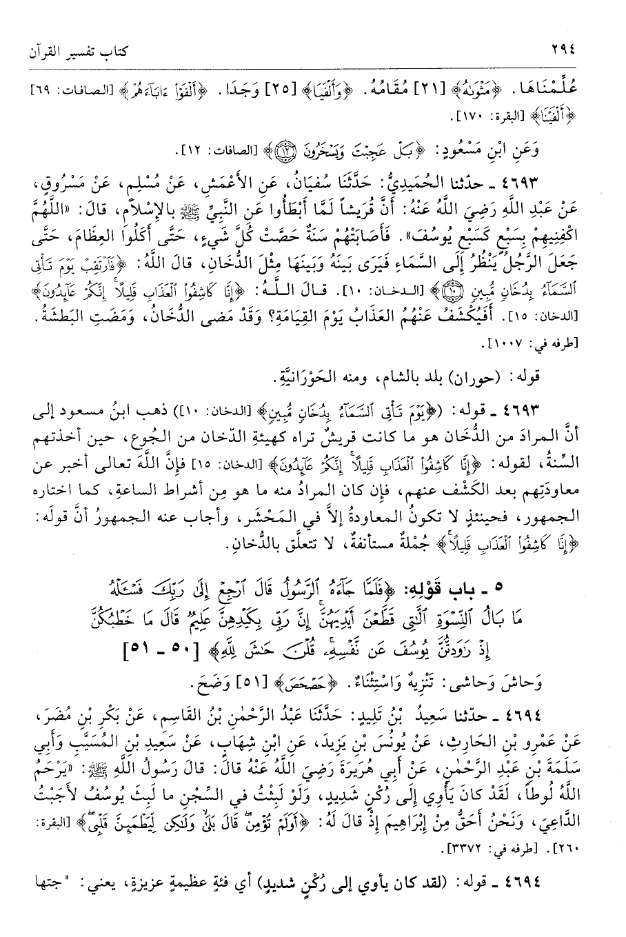 4693 - حَدَّثَنَا الْحُمَيْدِىُّ حَدَّثَنَا سُفْيَانُ عَنِ الأَعْمَشِ عَنْ مُسْلِمٍ عَنْ مَسْرُوقٍ عَنْ عَبْدِ اللَّهِ - رضى الله عنه - أَنَّ قُرَيْشًا لَمَّا أَبْطَئُوا عَنِ النَّبِىِّ - صلى الله عليه وسلم - بِالإِسْلاَمِ قَالَ «اللَّهُمَّ اكْفِنِيهِمْ بِسَبْعٍ كَسَبْعِ يُوسُفَ» فَأَصَابَتْهُمْ سَنَةٌ حَصَّتْ كُلَّ شَىْءٍ حَتَّى أَكَلُوا الْعِظَامَ حَتَّى جَعَلَ الرَّجُلُ يَنْظُرُ إِلَى السَّمَاءِ فَيَرَى بَيْنَهُ وَبَيْنَهَا مِثْلَ الدُّخَانِ قَالَ اللَّهُ {فَارْتَقِبْ يَوْمَ تَأْتِي السَّمَاءُ بِدُخَانٍ مُبِينٍ (10)} [الدخان: 10] قَالَ اللَّهُ {إِنَّا كَاشِفُو الْعَذَابِ قَلِيلًا إِنَّكُمْ عَائِدُونَ} [الدخان: 15] أَفَيُكْشَفُ عَنْهُمُ الْعَذَابُ يَوْمَ الْقِيَامَةِ، وَقَدْ مَضَى الدُّخَانُ وَمَضَتِ الْبَطْشَةُ. أطرافه 1007، 1020، 4767، 4774، 4809، 4820، 4821، 4822، 4823، 4824، 4825 - تحفة 9574 - 97/ 6