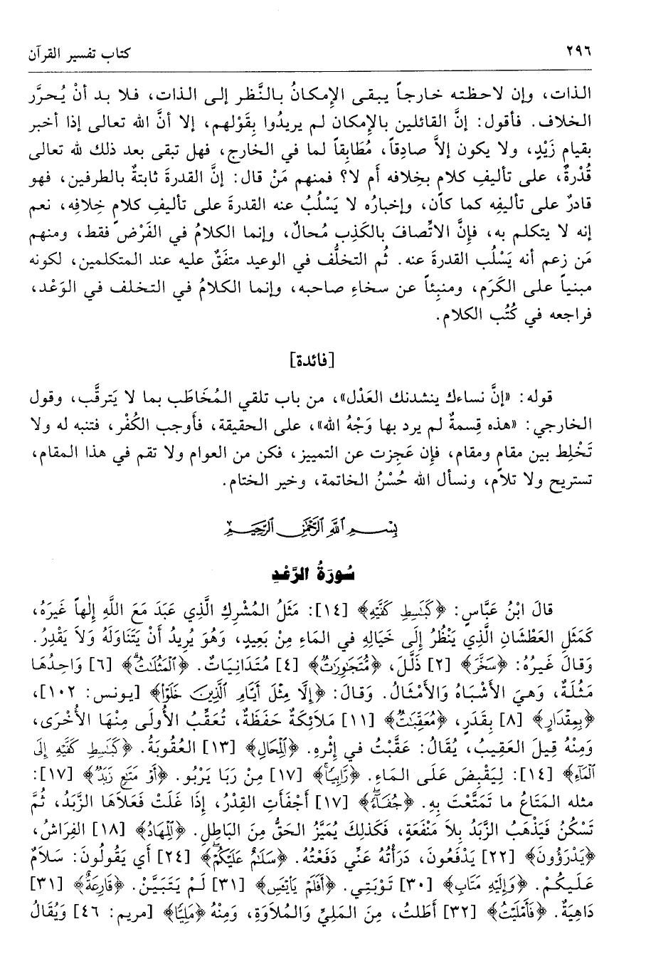 الذات، وإن لاحظته خارجًا يبقى الإِمكانُ بالنَّظر إلى الذات، فلا بد أنْ يُحرَّر الخلاف. فأقول: إنَّ القائلين بالإِمكان لم يريدُوا بِقَوْلهم، إلا أنَّ الله تعالى إذا أخبر بقيامِ زَيْدٍ، ولا يكون إلَّا صادِقًا، مُطَابِقًا لما في الخارج، فهل تبقى بعد ذلك تعالى قُدْرةٌ، على تأليفِ كلامٍ بخِلافه أَم لا؟ فمنهم مَنْ قال: إنَّ القدرةَ ثابتةٌ بالطرفين، فهو قادرٌ على تأليفِه كما كان، وإخبارُه لا يَسْلُبُ عنه القدرةَ على تأليفِ كلامٍ خِلافِه، نعم إنه لا يتكلم به، فإِنَّ الاتِّصافَ بالكَذِب مُحالٌ، وإنما الكلامُ في الفَرْض فقط، ومنهم مَن زعم أنه يَسْلُب القدرةَ عنه. ثُم التخلُّف في الوعيد متفَقٌ عليه عند المتكلمين، لكونه مبنيًا على الكَرَم، ومنبِئًا عن سخاءِ صاحبه، وإنما الكلامُ في التخلف في الوَعْد، فراجعه في كُتُب الكلام.