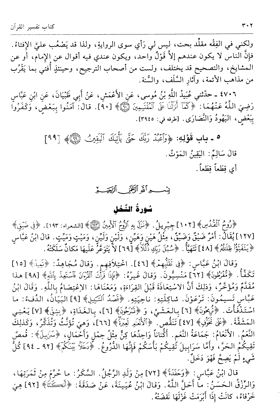 وَقالَ ابْنُ عَبَّاسٍ: {فِى تَقَلُّبِهِمْ} [46]. اخْتِلاَفِهِم. وَقالَ مُجَاهِدٌ: {تَمِيدَ} [15] تَكَفَّأُ. {مُّفْرَطُونَ} [62] مَنْسِيُّونَ. وَقالَ غَيرُهُ: {فَإِذَا قَرَأْتَ الْقُرْءانَ فَاسْتَعِذْ بِاللَّهِ} [98] هذا مُقَدَّمٌ وَمُؤَخَّرٌ، وَذلِكَ أَنَّ الاسْتِعَاذَةَ قَبْلَ القِرَاءَةِ، وَمَعْنَاهَا: الاِعْتِصَامُ بِاللَّهِ. {قَصْدُ السَّبِيلِ} [9] البَيَانُ، الدِّفءُ: ما اسْتَدْفَأْتَ. {تُرِيحُونَ} [6] بِالعَشَيِّ، وَ {تَسْرَحُونَ} [6]، بِالغَدَاةِ، {بِشِقّ} [7] يَعْنِي المَشَقَّةَ. {عَلَى تَخَوُّفٍ} [47] تَنَقُّصٍ. {الأنْعَامِ لَعِبْرَةً} [66]، وَهيَ تُؤَنَّثُ وَتُذَكَّرُ، وَكَذلِكَ النَّعَمُ. الأَنْعَامُ: جَمَاعَةُ النَّعَمِ. أَكْنانًا وَاحِدُهَا كِنٌّ مِثْلُ حِمْلٍ وَأَحْمَالٍ، {سَرَابِيلَ}: قُمصٌ تَقِيكُمُ الحَرَّ، وأَمَّا سَرَابِيلَ تَقِيكُمْ بَأْسَكُمْ فَإِنَّهَا الدُّرُوعُ. {دَخَلًا بَيْنَكُمْ} [92 - 94] كُلُّ شَيءٍ لَمْ يَصِحَّ فَهْوَ دَخَلٌ.