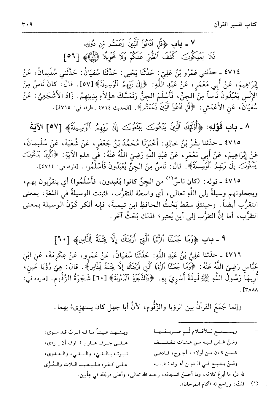 4714 - حَدَّثَنِى عَمْرُو بْنُ عَلِىٍّ حَدَّثَنَا يَحْيَى حَدَّثَنَا سُفْيَانُ حَدَّثَنِى سُلَيْمَانُ عَنْ إِبْرَاهِيمَ عَنْ أَبِى مَعْمَرٍ عَنْ عَبْدِ اللَّهِ {إِلَى رَبِّهِمُ الْوَسِيلَةَ} [الإسراء: 57] قَالَ كَانَ نَاسٌ مِنَ الإِنْسِ يَعْبُدُونَ نَاسًا مِنَ الْجِنِّ، فَأَسْلَمَ الْجِنُّ، وَتَمَسَّكَ هَؤُلاَءِ بِدِينِهِمْ. زَادَ الأَشْجَعِىُّ عَنْ سُفْيَانَ عَنِ الأَعْمَشِ. {قُلِ ادْعُوا الَّذِينَ زَعَمْتُمْ}. طرفه 4715 - تحفة 9337