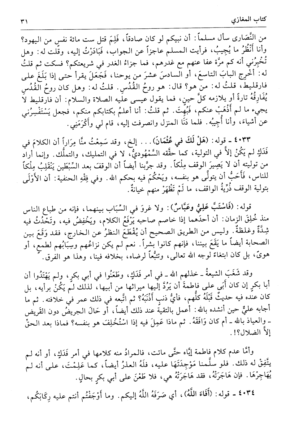 4033 - قوله: (هَلْ لَكَ في عُثْمَانَ) ... إلخ، وقد سَمِعْتُ منَّا مِرَارًا أن الكلامَ في فَدَكٍ لم يَكُنْ إرَّ في التولية، كما حقَّقه السَّمْهُوديُّ، لا في التمليك، والتملُّك. وإنما أراد من توليته أن لا يَصِيرَ الوقف مِلْكًا. وقد جرَّبنا أيضًا أن الوقفَ بعد السِّبْطَين يَنْقَلِبُ مِلْكًا للناس، فَأَحَبُّ أن يتولَّى هو بنفسه، ويَحْكُمَ فيه بحكم الله. وفي فِقْهِ الحنفية: أن الأَوْلَى بتولية الوقف ذُرِّيةُ الواقف، ما لَمْ تَظْهَرْ منهم خيانةٌ.