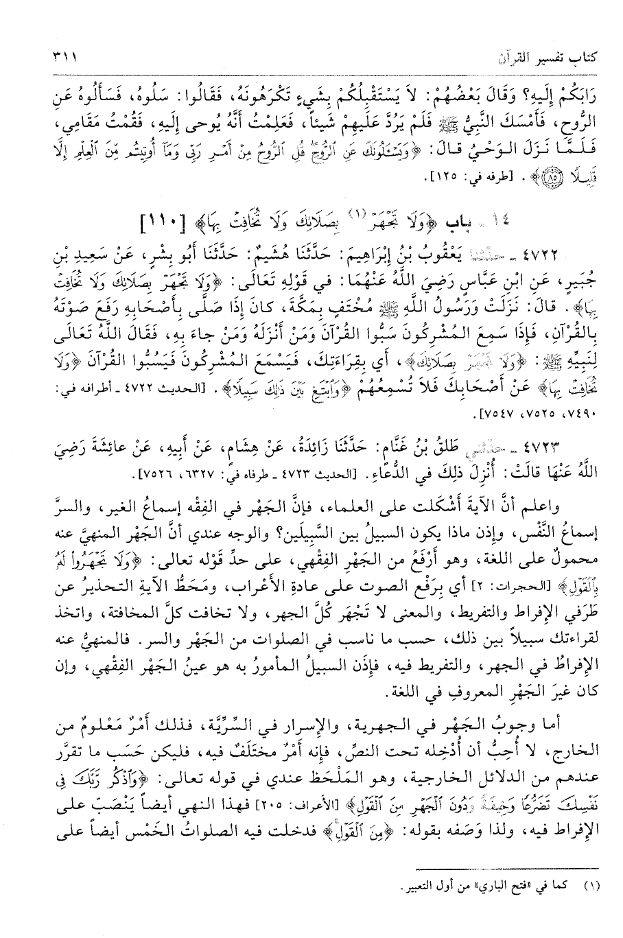 4722 - حَدَّثَنَا يَعْقُوبُ بْنُ إِبْرَاهِيمَ حَدَّثَنَا هُشَيْمٌ حَدَّثَنَا أَبُو بِشْرٍ عَنْ سَعِيدِ بْنِ جُبَيْرٍ عَنِ ابْنِ عَبَّاسٍ - رضى الله عنهما - فِى قَوْلِهِ تَعَالَى {وَلَا تَجْهَرْ بِصَلَاتِكَ وَلَا تُخَافِتْ بِهَا} قَالَ نَزَلَتْ وَرَسُولُ اللَّهِ - صلى الله عليه وسلم - مُخْتَفٍ بِمَكَّةَ، كَانَ إِذَا صَلَّى بِأَصْحَابِهِ رَفَعَ صَوْتَهُ بِالْقُرْآنِ فَإِذَا سَمِعَهُ الْمُشْرِكُونَ سَبُّوا الْقُرْآنَ وَمَنْ أَنْزَلَهُ، وَمَنْ جَاءَ بِهِ، فَقَالَ اللَّهُ تَعَالَى لِنَبِيِّهِ - صلى الله عليه وسلم - {وَلَا تَجْهَرْ بِصَلَاتِكَ} أَىْ بِقِرَاءَتِكَ، فَيَسْمَعَ الْمُشْرِكُونَ، فَيَسُبُّوا الْقُرْآنَ، {وَلَا تُخَافِتْ بِهَا} عَنْ أَصْحَابِكَ فَلاَ تُسْمِعُهُمْ {وَابْتَغِ بَيْنَ ذَلِكَ سَبِيلًا}. أطرافه 7490، 7525، 7547 - تحفة 5451