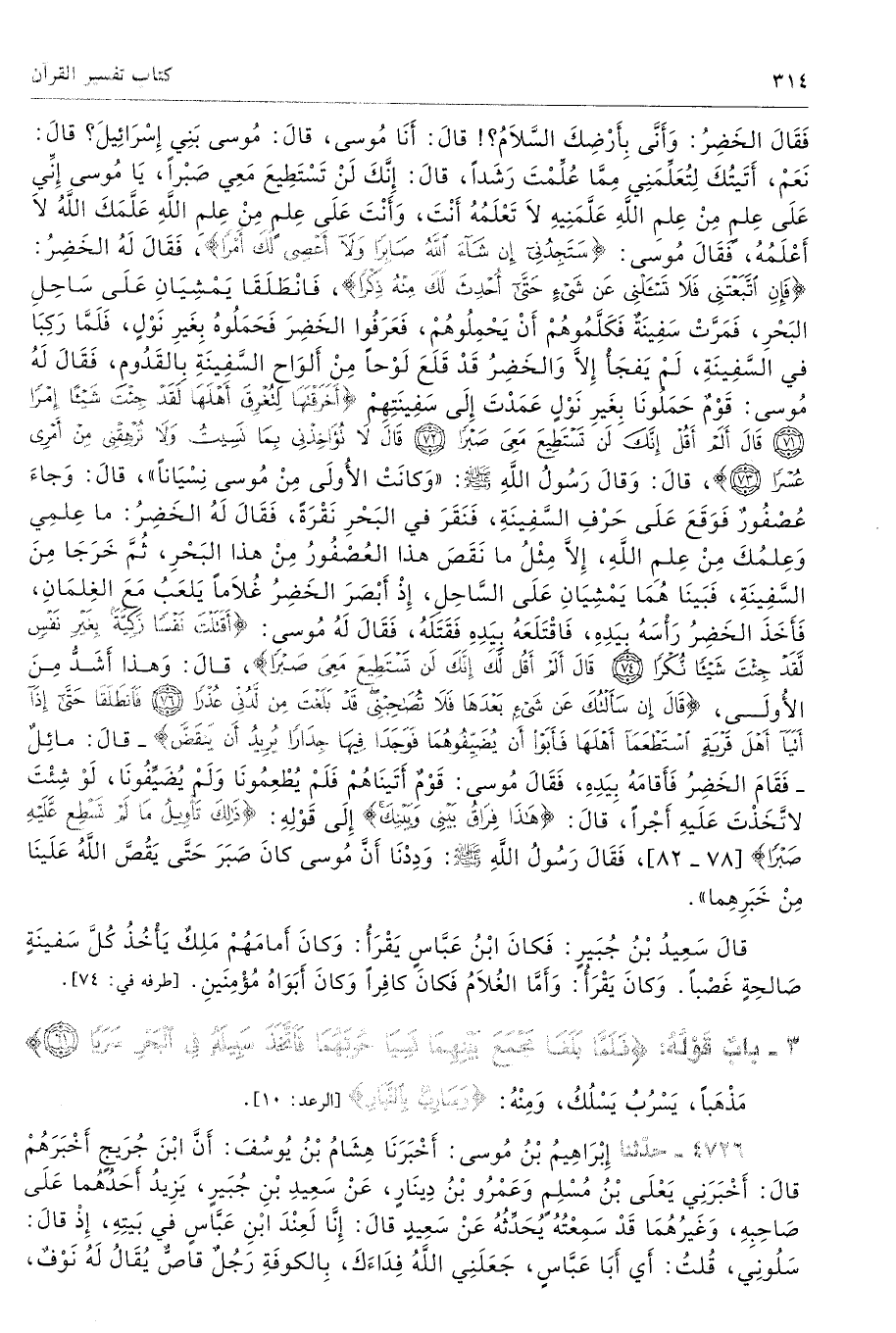 قَالَ سَعِيدُ بْنُ جُبَيْرٍ فَكَانَ ابْنُ عَبَّاسٍ يَقْرَأُ وَكَانَ أَمَامَهُمْ مَلِكٌ يَأْخُذُ كُلَّ سَفِينَةٍ صَالِحَةٍ غَصْبًا، وَكَانَ يَقْرَأُ وَأَمَّا الْغُلاَمُ فَكَانَ كَافِرًا وَكَانَ أَبَوَاهُ مُؤْمِنَيْنِ. أطرافه 74، 78، 122، 2267، 2728، 3278، 3400، 3401، 4726، 4727، 6672، 7478 - تحفة 39 - 112/ 6