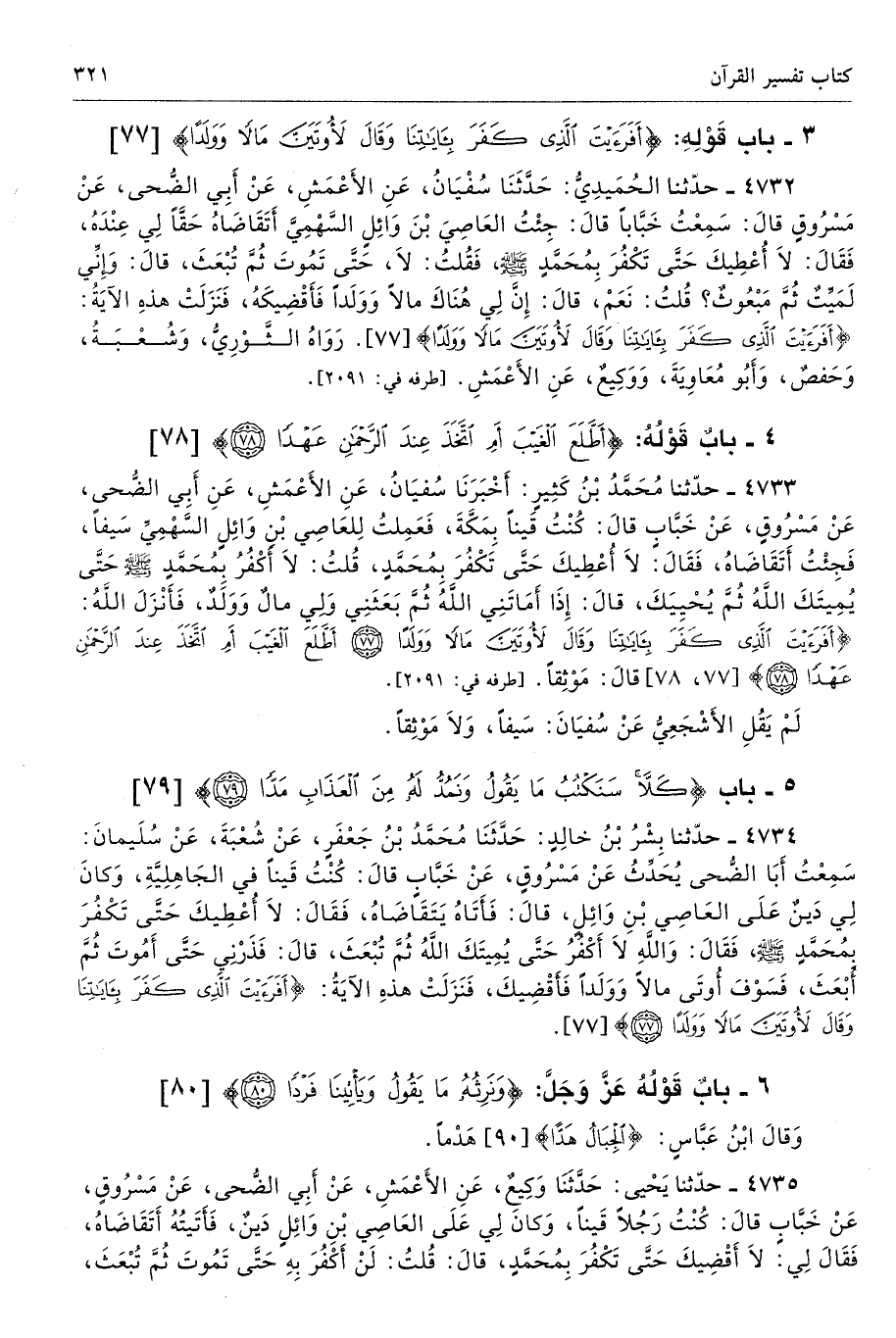 4732 - حَدَّثَنَا الْحُمَيْدِىُّ حَدَّثَنَا سُفْيَانُ عَنِ الأَعْمَشِ عَنْ أَبِى الضُّحَى عَنْ مَسْرُوقٍ قَالَ سَمِعْتُ خَبَّابًا قَالَ جِئْتُ الْعَاصِىَ بْنَ وَائِلٍ السَّهْمِىَّ أَتَقَاضَاهُ حَقًّا لِى عِنْدَهُ، فَقَالَ لاَ أُعْطِيكَ حَتَّى تَكْفُرَ بِمُحَمَّدٍ فَقُلْتُ لاَ حَتَّى تَمُوتَ ثُمَّ تُبْعَثَ. قَالَ وَإِنِّى لَمَيِّتٌ ثُمَّ مَبْعُوثٌ قُلْتُ نَعَمْ. قَالَ إِنَّ لِى هُنَاكَ مَالاً وَوَلَدًا فَأَقْضِيكَهُ، فَنَزَلَتْ هَذِهِ الآيَةُ {أَفَرَأَيْتَ الَّذِي كَفَرَ بِآيَاتِنَا وَقَالَ لَأُوتَيَنَّ مَالًا وَوَلَدًا} [مريم: 77] رَوَاهُ الثَّوْرِىُّ وَشُعْبَةُ وَحَفْصٌ وَأَبُو مُعَاوِيَةَ وَوَكِيعٌ عَنِ الأَعْمَشِ. أطرافه 2091، 2275، 2425، 4733، 4734، 4735 - تحفة 3520