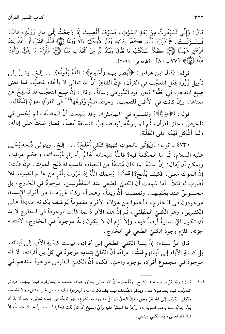 قال ابنُ سيناء: إنَّ نِسبةَ الكلي الطبعي إلى أفرادِه، ليست كنِسْبةِ الأب إلى أبنائه، بل كنسبةِ الآباء إلى أبنائهم قلتُ: مرادُه أنَّ الكليَّ بتمامِه موجودٌ في كلَ مِن أفراده، لا أنه موجودٌ في مجموع أفرادِه بوجود واحدٍ، فكما أنَّ الكليَّ الطبعي موجودٌ عندهم في
