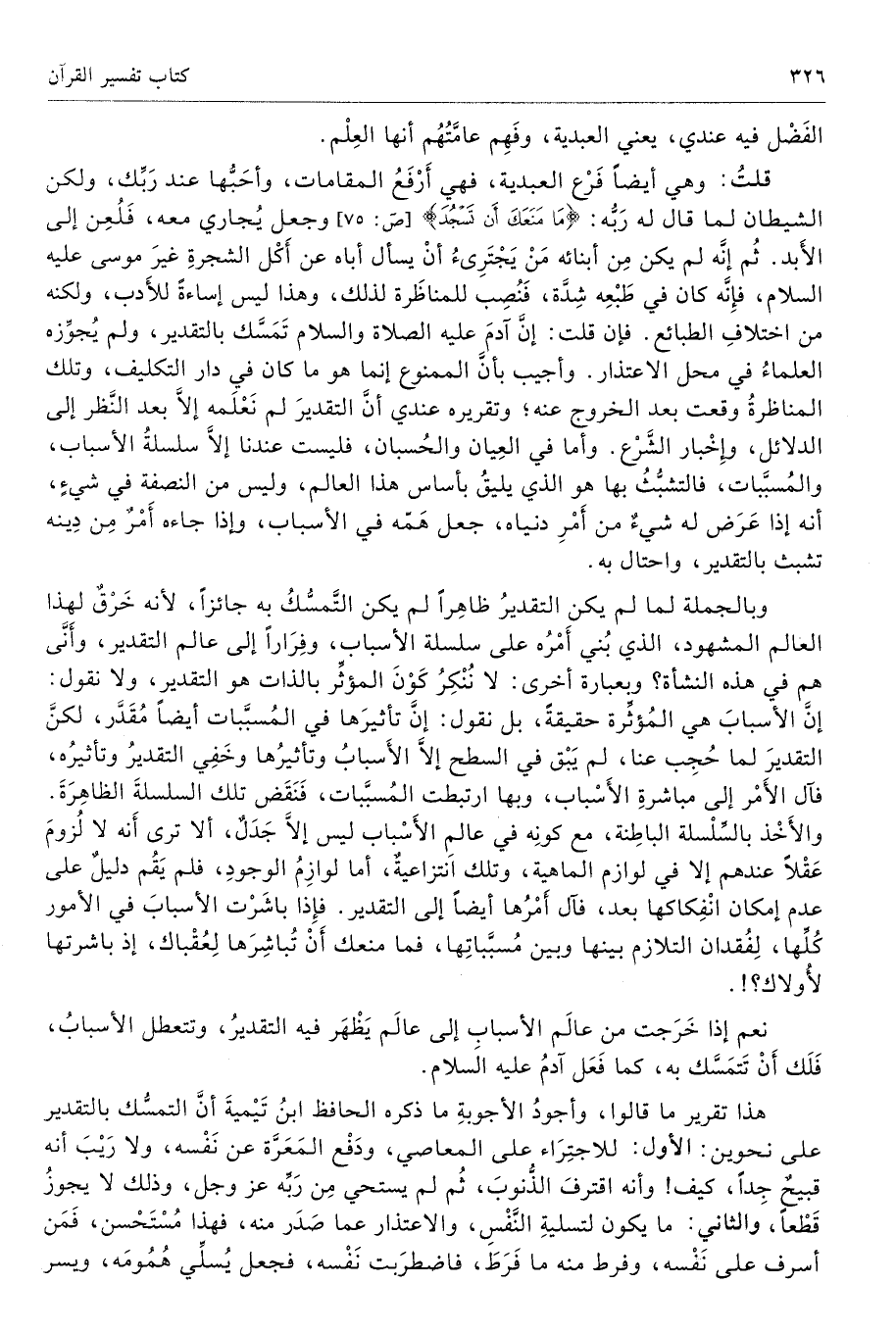 وبالجملة لما لم يكن التقديرُ ظاهِرًا لم يكن التَّمسُّكُ به جائزًا، لأنه خَرْقٌ لهذا العالم المشهود، الذي بُني أَمْرُه على سلسلة الأسباب، وفِرَارًا إلى عالم التقدير، وأَنَّى هم في هذه النشأة؟ وبعبارة أخرى: لا نُنْكِرُ كَوْنَ المؤثِّر بالذات هو التقدير، ولا نقول: إنَّ الأسبابَ هي المُؤثِّرة حقيقةً، بل نقول: إنَّ تأثيرَها في المُسبَّبات أيضًا مُقَدَّر، لكنَّ التقديرَ لما حُجِب عنا، لم يَبْق في السطح إلَّا الأَسبابُ وتأثيرُها وخَفِي التقديرُ وتأثيرُه، فآل الأَمْر إلى مباشرةِ الأَسْباب، وبها ارتبطت المُسبَّبات، فَنَقَض تلك السلسلةَ الظاهِرَةَ. والأَخْذ بالسِّلْسلة الباطِنة، مع كونِه في عالمِ الأَسْباب ليس إلَّا جَدَلٌ، ألا ترى أَنه لا لُزومَ عَقْلًا عندهم إلا في لوازم الماهية، وتلك انتزاعيةٌ، أما لوازِمُ الوجودِ، فلم يَقُم دليلٌ على عدم إمكان انْفِكاكها بعد، فآل أَمْرُها أيضًا إلى التقدير. فإِذا باشَرْت الأسبابَ في الأمور كُلِّها، لِفُقدان التلازم بينها وبين مُسبَّباتِها، فما منعك أَنْ تُباشِرَها لِعُقْباك، إذ باشرتها لأُولاك؟!.