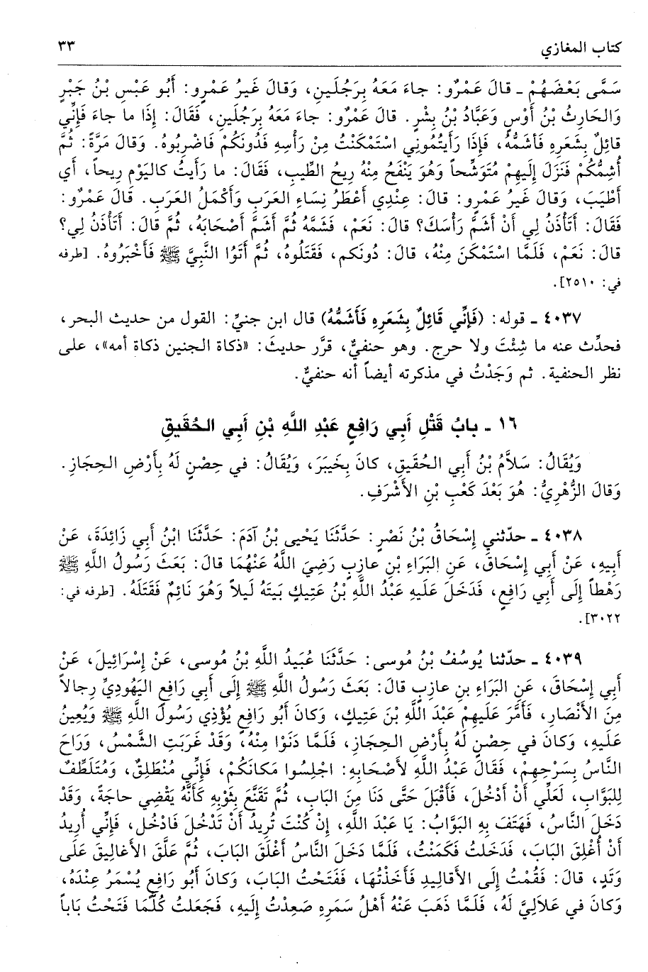 4038 - حَدَّثَنِى إِسْحَاقُ بْنُ نَصْرٍ حَدَّثَنَا يَحْيَى بْنُ آدَمَ حَدَّثَنَا ابْنُ أَبِى زَائِدَةَ عَنْ أَبِيهِ عَنْ أَبِى إِسْحَاقَ عَنِ الْبَرَاءِ بْنِ عَازِبٍ - رضى الله عنهما - قَالَ بَعَثَ رَسُولُ اللَّهِ - صلى الله عليه وسلم - رَهْطًا إِلَى أَبِى رَافِعٍ فَدَخَلَ عَلَيْهِ عَبْدُ اللَّهِ بْنُ عَتِيكٍ بَيْتَهُ لَيْلاً وَهْوَ نَائِمٌ فَقَتَلَهُ. أطرافه 3022، 3023، 4039، 4040 - تحفة 1830