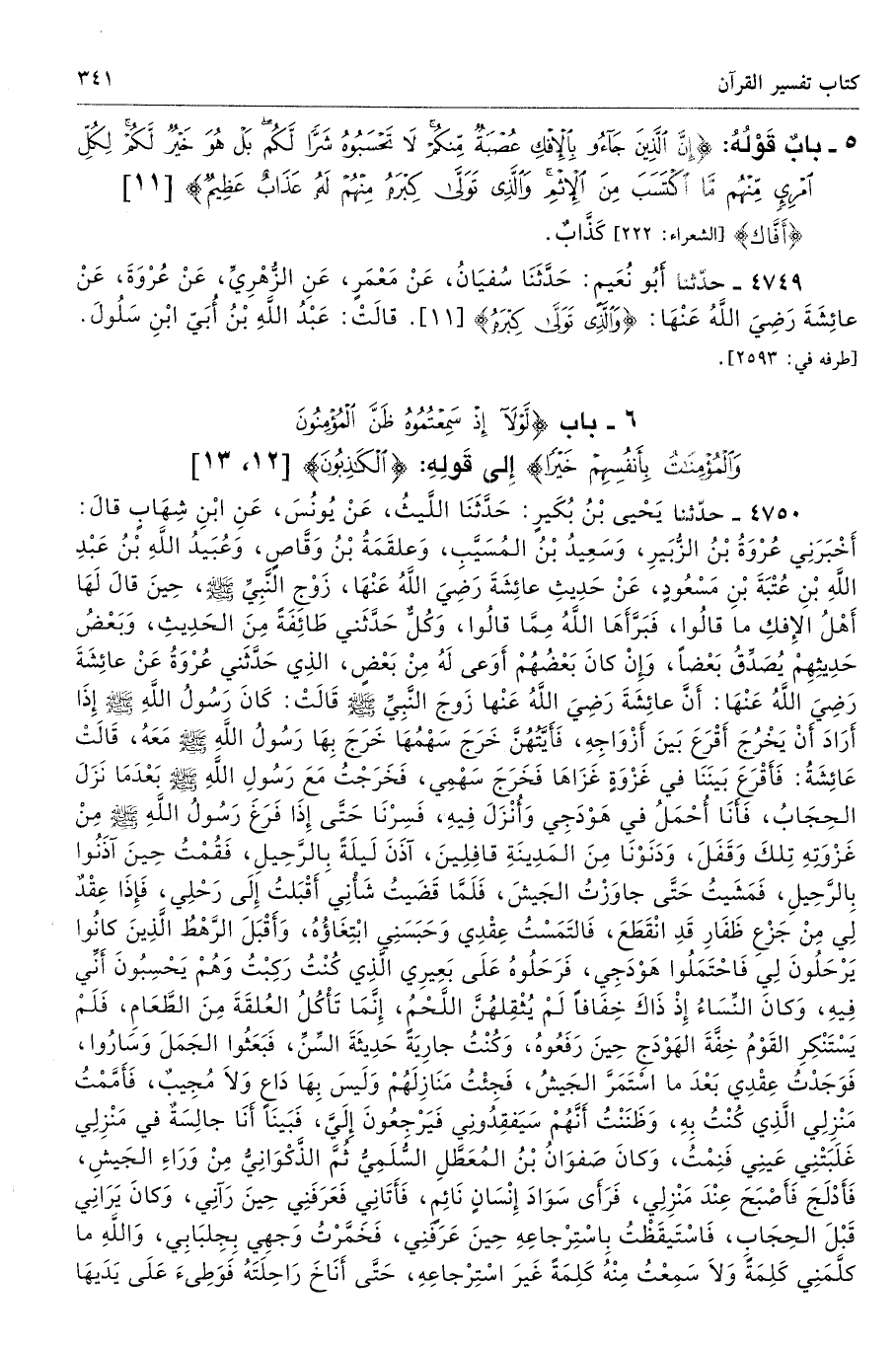 4749 - حَدَّثَنَا أَبُو نُعَيْمٍ حَدَّثَنَا سُفْيَانُ عَنْ مَعْمَرٍ عَنِ الزُّهْرِىِّ عَنْ عُرْوَةَ عَنْ عَائِشَةَ - رضى الله عنها - {وَالَّذِي تَوَلَّى كِبْرَهُ} [النور: 11] قَالَتْ عَبْدُ اللَّهِ بْنُ أُبَىٍّ ابْنُ سَلُولَ. أطرافه 2593، 2637، 2661، 2688، 2879، 4025، 4141، 4690، 4750، 4757، 5212، 6662، 6679، 7369، 7370، 7500، 7545 - تحفة 16649