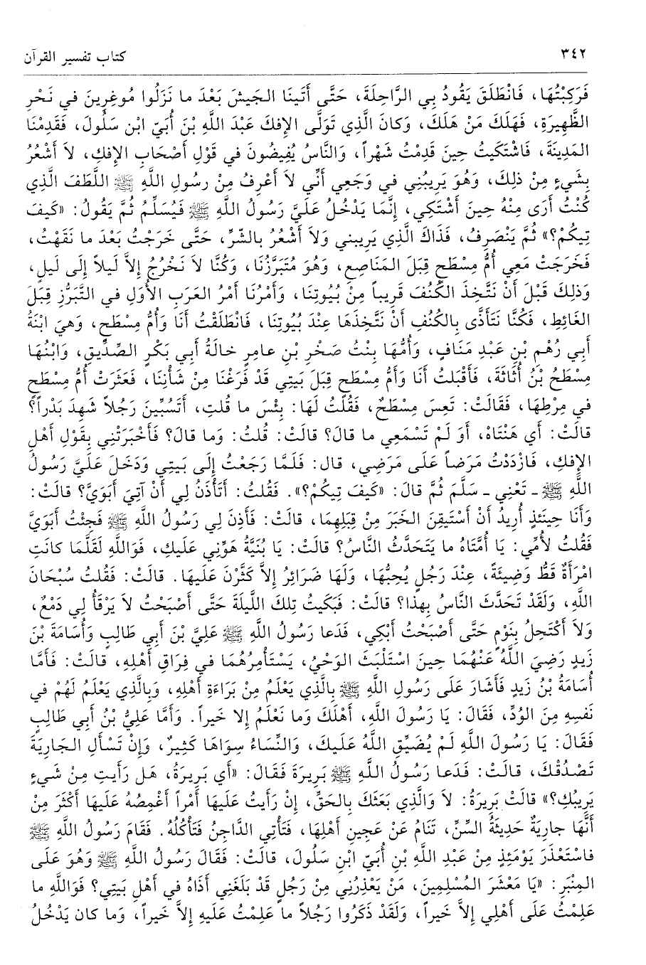 فَرَكِبْتُهَا فَانْطَلَقَ يَقُودُ بِى الرَّاحِلَةَ حَتَّى أَتَيْنَا الْجَيْشَ، بَعْدَ مَا نَزَلُوا مُوغِرِينَ فِى نَحْرِ الظَّهِيرَةِ، فَهَلَكَ مَنْ هَلَكَ، وَكَانَ الَّذِى تَوَلَّى الإِفْكَ عَبْدَ اللَّهِ بْنَ أُبَىٍّ ابْنَ سَلُولَ فَقَدِمْنَا الْمَدِينَةَ، فَاشْتَكَيْتُ حِينَ قَدِمْتُ شَهْرًا، وَالنَّاسُ يُفِيضُونَ فِى قَوْلِ أَصْحَابِ الإِفْكِ، لاَ أَشْعُرُ بِشَىْءٍ مِنْ ذَلِكَ، وَهْوَ يَرِيبُنِى فِى وَجَعِى أَنِّى لاَ أَعْرِفُ مِنْ رَسُولِ اللَّهِ - صلى الله عليه وسلم - اللَّطَفَ الَّذِى كُنْتُ أَرَى مِنْهُ حِينَ أَشْتَكِى، إِنَّمَا يَدْخُلُ عَلَىَّ رَسُولُ اللَّهِ - صلى الله عليه وسلم - فَيُسَلِّمُ ثُمَّ يَقُولُ «كَيْفَ تِيكُمْ». ثُمَّ يَنْصَرِفُ، فَذَاكَ الَّذِى يَرِيبُنِى، وَلاَ أَشْعُرُ حَتَّى خَرَجْتُ بَعْدَ مَا نَقَهْتُ، فَخَرَجَتْ مَعِى أُمُّ مِسْطَحٍ قِبَلَ الْمَنَاصِعِ، وَهْوَ مُتَبَرَّزُنَا، وَكُنَّا لاَ نَخْرُجُ إِلاَّ لَيْلاً إِلَى لَيْلٍ، وَذَلِكَ قَبْلَ أَنْ نَتَّخِذَ الْكُنُفَ قَرِيبًا مِنْ بُيُوتِنَا، وَأَمْرُنَا أَمْرُ الْعَرَبِ الأُوَلِ فِى التَّبَرُّزِ قِبَلَ الْغَائِطِ، فَكُنَّا نَتَأَذَّى بِالْكُنُفِ أَنْ نَتَّخِذَهَا عِنْدَ بُيُوتِنَا فَانْطَلَقْتُ أَنَا وَأُمُّ مِسْطَحٍ، وَهْىَ ابْنَةُ أَبِى رُهْمِ بْنِ عَبْدِ مَنَافٍ، وَأُمُّهَا بِنْتُ صَخْرِ بْنِ عَامِرٍ خَالَةُ أَبِى بَكْرٍ الصِّدِّيقِ، وَابْنُهَا مِسْطَحُ بْنُ أُثَاثَةَ، فَأَقْبَلْتُ أَنَا وَأُمُّ مِسْطَحٍ قِبَلَ بَيْتِى، قَدْ فَرَغْنَا مِنْ شَأْنِنَا، فَعَثَرَتْ أُمُّ مِسْطَحٍ فِى مِرْطِهَا فَقَالَتْ تَعِسَ مِسْطَحٌ. فَقُلْتُ لَهَا بِئْسَ مَا قُلْتِ أَتَسُبِّينَ رَجُلاً شَهِدَ بَدْرًا قَالَتْ أَىْ هَنْتَاهُ، أَوَلَمْ تَسْمَعِى مَا قَالَ قَالَتْ قُلْتُ وَمَا قَالَ فَأَخْبَرَتْنِى بِقَوْلِ أَهْلِ الإِفْكِ فَازْدَدْتُ مَرَضًا عَلَى مَرَضِى، فَلَمَّا رَجَعْتُ إِلَى بَيْتِى وَدَخَلَ عَلَىَّ رَسُولُ اللَّهِ - صلى الله عليه وسلم - تَعْنِى سَلَّمَ ثُمَّ قَالَ «كَيْفَ تِيكُمْ». فَقُلْتُ أَتَأْذَنُ لِى أَنْ آتِىَ أَبَوَىَّ قَالَتْ وَأَنَا حِينَئِذٍ أُرِيدُ أَنْ أَسْتَيْقِنَ الْخَبَرَ مِنْ قِبَلِهِمَا، قَالَتْ فَأَذِنَ لِى رَسُولُ اللَّهِ - صلى الله عليه وسلم - فَجِئْتُ أَبَوَىَّ فَقُلْتُ لأُمِّى يَا أُمَّتَاهْ، مَا يَتَحَدَّثُ النَّاسُ قَالَتْ يَا بُنَيَّةُ، هَوِّنِى عَلَيْكَ فَوَاللَّهِ، لَقَلَّمَا كَانَتِ امْرَأَةٌ قَطُّ وَضِيئَةً عِنْدَ رَجُلٍ يُحِبُّهَا وَلَهَا ضَرَائِرُ إِلاَّ كَثَّرْنَ عَلَيْهَا. قَالَتْ فَقُلْتُ سُبْحَانَ اللَّهِ وَلَقَدْ تَحَدَّثَ النَّاسُ بِهَذَا قَالَتْ فَبَكَيْتُ تِلْكَ اللَّيْلَةَ حَتَّى أَصْبَحْتُ لاَ يَرْقَأُ لِى دَمْعٌ، وَلاَ أَكْتَحِلُ بِنَوْمٍ حَتَّى أَصْبَحْتُ أَبْكِى فَدَعَا رَسُولُ اللَّهِ - صلى الله عليه وسلم - عَلِىَّ بْنَ أَبِى طَالِبٍ، وَأُسَامَةَ بْنَ زَيْدٍ - رضى الله عنهما - حِينَ اسْتَلْبَثَ الْوَحْىُ، يَسْتَأْمِرُهُمَا فِى فِرَاقِ أَهْلِهِ، قَالَتْ فَأَمَّا أُسَامَةُ بْنُ زَيْدٍ فَأَشَارَ عَلَى رَسُولِ اللَّهِ - صلى الله عليه وسلم - بِالَّذِى يَعْلَمُ مِنْ بَرَاءَةِ أَهْلِهِ، وَبِالَّذِى يَعْلَمُ لَهُمْ فِى نَفْسِهِ مِنَ الْوُدِّ، فَقَالَ يَا رَسُولَ اللَّهِ، أَهْلَكَ، وَمَا نَعْلَمُ إِلاَّ خَيْرًا، وَأَمَّا عَلِىُّ بْنُ أَبِى طَالِبٍ فَقَالَ يَا رَسُولَ اللَّهِ، لَمْ يُضَيِّقِ اللَّهُ عَلَيْكَ وَالنِّسَاءُ سِوَاهَا كَثِيرٌ، وَإِنْ تَسْأَلِ الْجَارِيَةَ تَصْدُقْكَ، قَالَتْ فَدَعَا رَسُولُ اللَّهِ - صلى الله عليه وسلم - بَرِيرَةَ فَقَالَ «أَىْ بَرِيرَةُ، هَلْ رَأَيْتِ عَلَيْهَا مِنْ شَىْءٍ يَرِيبُكِ». قَالَتْ بَرِيرَةُ لاَ وَالَّذِى بَعَثَكَ 