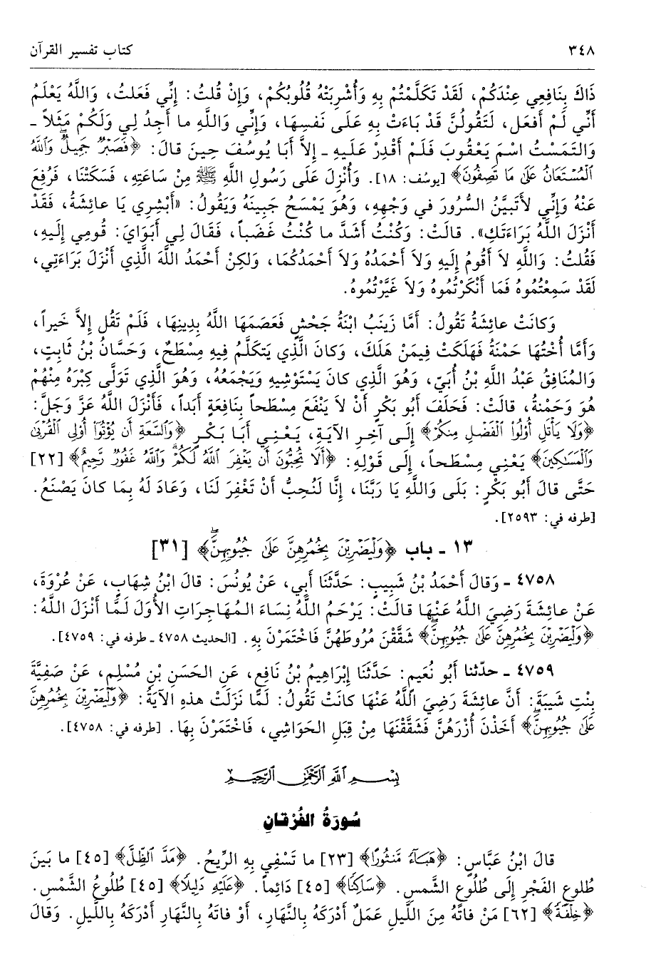 4759 - حَدَّثَنَا أَبُو نُعَيْمٍ حَدَّثَنَا إِبْرَاهِيمُ بْنُ نَافِعٍ عَنِ الْحَسَنِ بْنِ مُسْلِمٍ عَنْ صَفِيَّةَ بِنْتِ شَيْبَةَ أَنَّ عَائِشَةَ - رضى الله عنها - كَانَتْ تَقُولُ لَمَّا نَزَلَتْ هَذِهِ الآيَةُ {وَلْيَضْرِبْنَ بِخُمُرِهِنَّ عَلَى جُيُوبِهِنَّ} أَخَذْنَ أُزْرَهُنَّ فَشَقَّقْنَهَا مِنْ قِبَلِ الْحَوَاشِى فَاخْتَمَرْنَ بِهَا. طرفه 4758 - تحفة 17851 - 137/ 6
