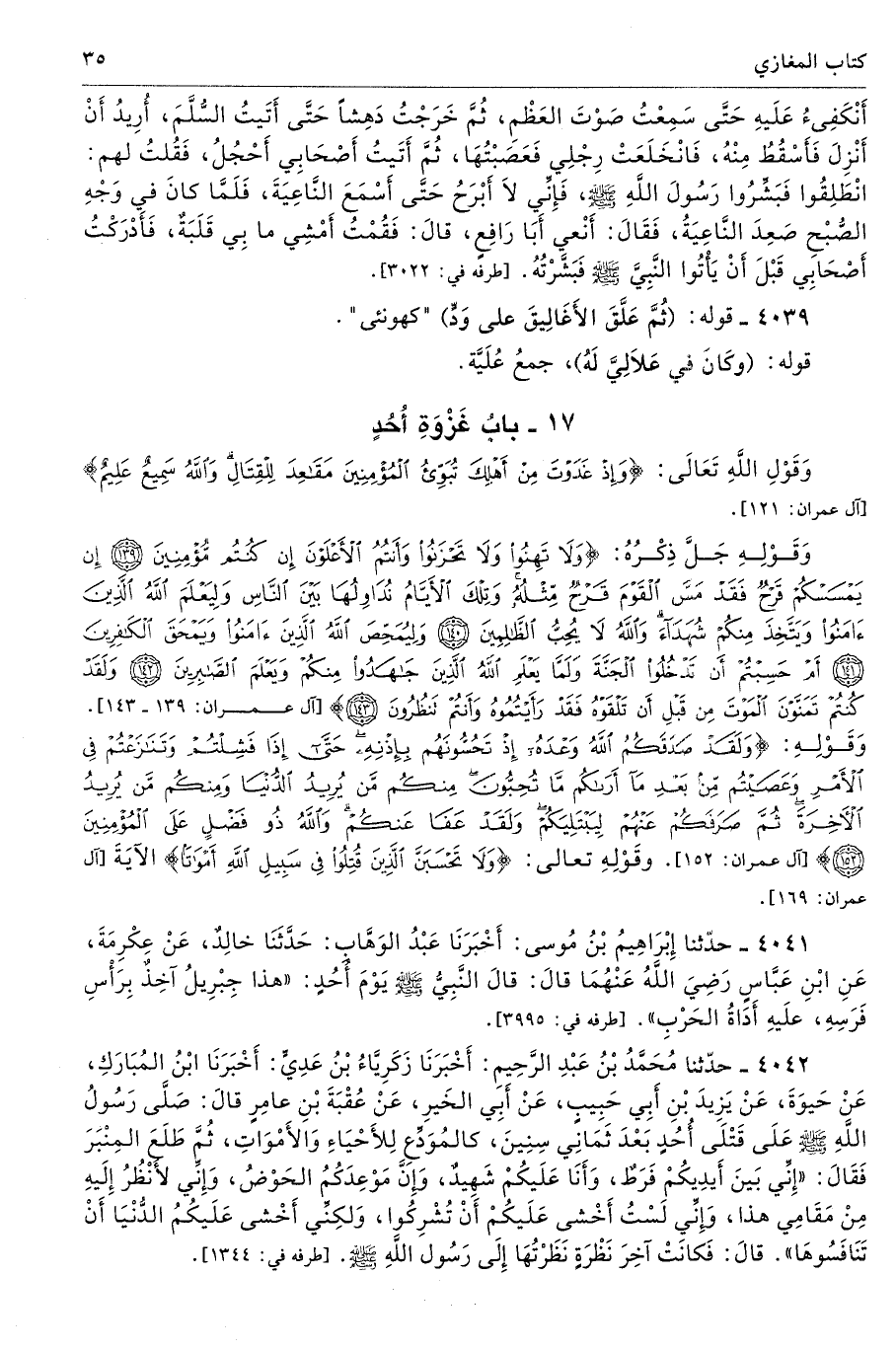 4041 - حَدَّثَنَا إِبْرَاهِيمُ بْنُ مُوسَى أَخْبَرَنَا عَبْدُ الْوَهَّابِ حَدَّثَنَا خَالِدٌ عَنْ عِكْرِمَةَ عَنِ ابْنِ عَبَّاسٍ - رضى الله عنهما - قَالَ قَالَ النَّبِىُّ - صلى الله عليه وسلم - يَوْمَ أُحُدٍ «هَذَا جِبْرِيلُ آخِذٌ بِرَأْسِ فَرَسِهِ عَلَيْهِ أَدَاةُ الْحَرْبِ». طرفه 3995 - تحفة 6060