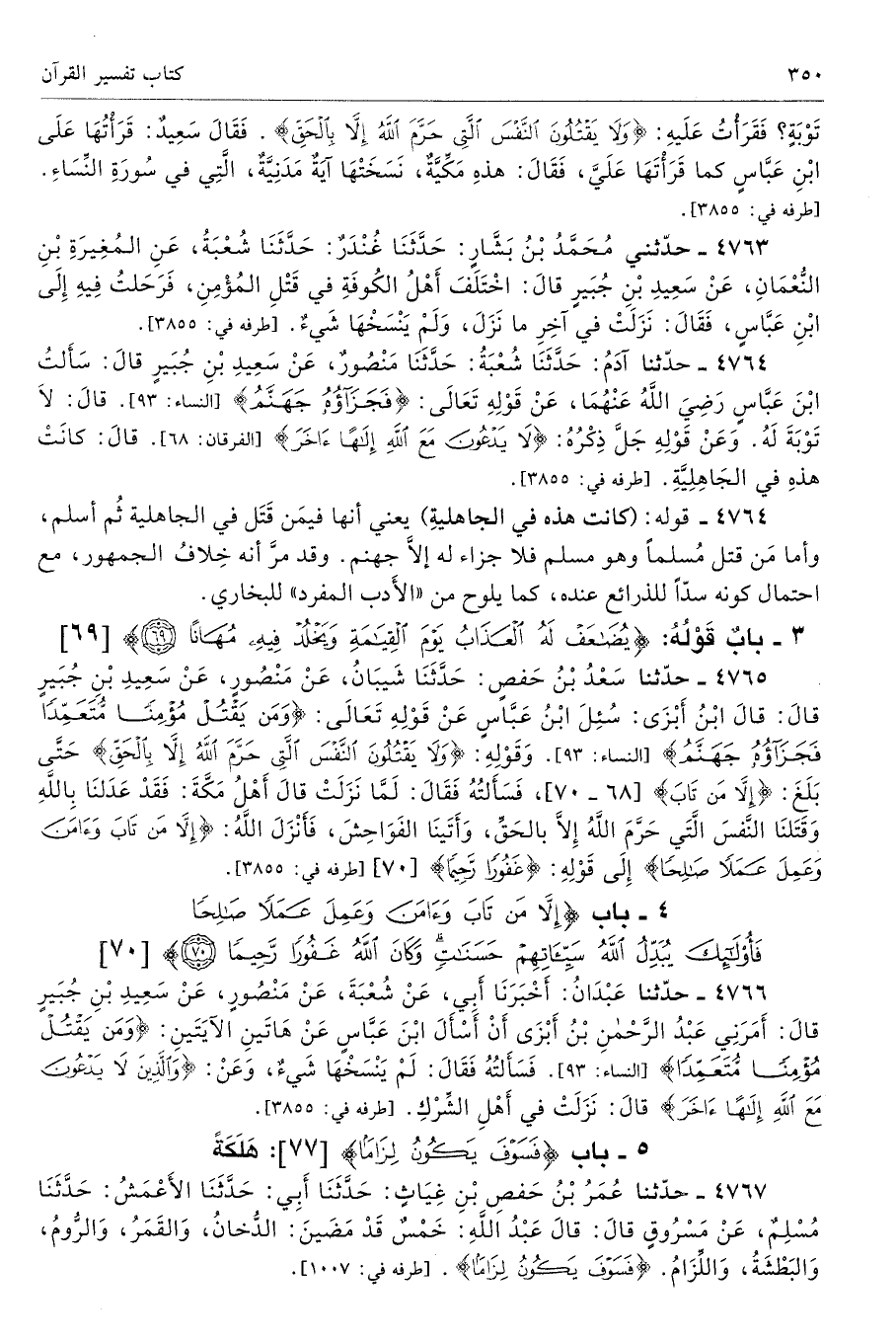 4763 - حَدَّثَنِى مُحَمَّدُ بْنُ بَشَّارٍ حَدَّثَنَا غُنْدَرٌ حَدَّثَنَا شُعْبَةُ عَنِ الْمُغِيرَةِ بْنِ النُّعْمَانِ عَنْ سَعِيدِ بْنِ جُبَيْرٍ قَالَ اخْتَلَفَ أَهْلُ الْكُوفَةِ فِى قَتْلِ الْمُؤْمِنِ، فَرَحَلْتُ فِيهِ إِلَى ابْنِ عَبَّاسٍ، فَقَالَ نَزَلَتْ فِى آخِرِ مَا نَزَلَ وَلَمْ يَنْسَخْهَا شَىْءٌ. أطرافه 3855، 4590، 4762، 4764، 4765، 4766 - تحفة 5621