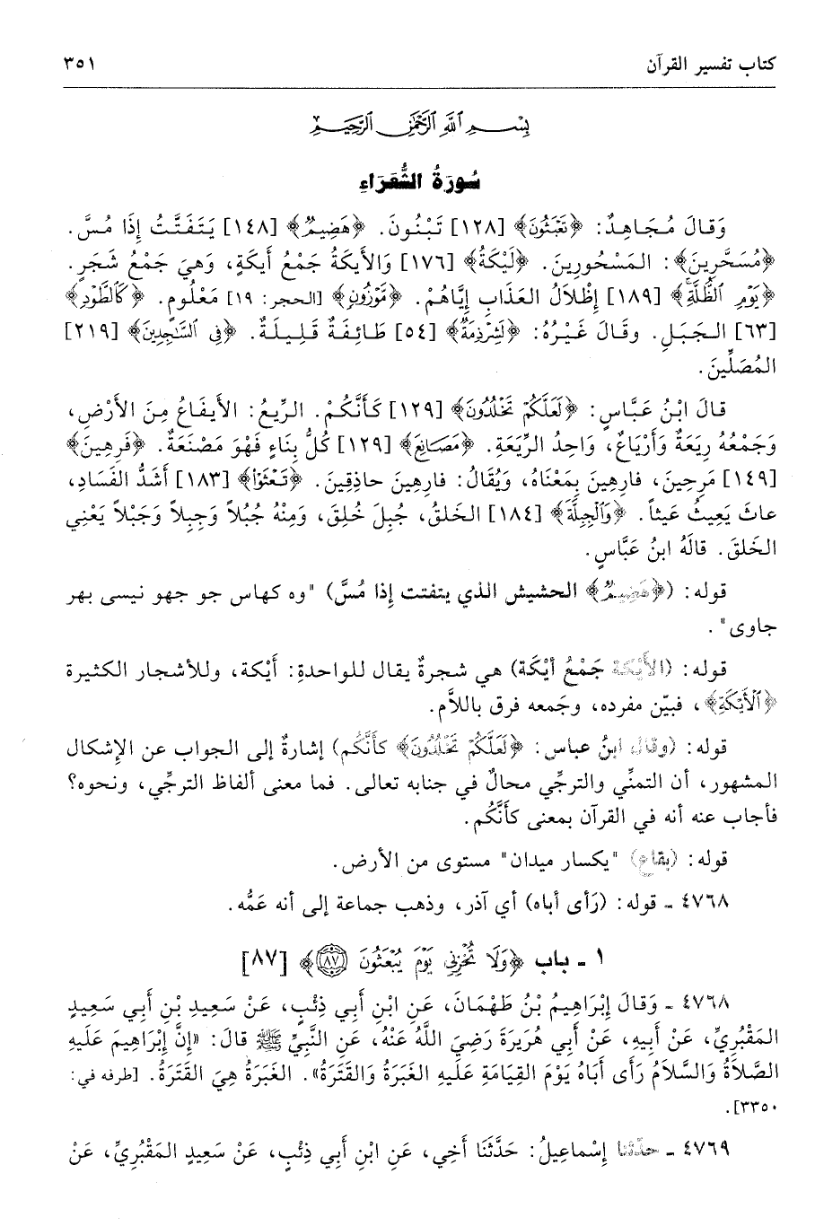 وَقالَ مُجَاهِدٌ: {تَعْبَثُونَ} [128] تَبْنُونَ. {هَضِيمٌ} [148] يَتَفَتَّتُ إِذَا مُسَّ. {مُسَحَّرِينَ}: المَسْحُورِينَ. {لَيْكَةُ} [176] وَالأَيكَةُ جَمْعُ أَيكَةٍ، وَهيَ جَمْعُ شَجَرٍ. {يَوْمِ الظُّلَّةِ} [189] إِظْلاَلُ العَذَابِ إِيَّاهُمْ. {مَّوْزُونٍ} [الحجر: 19] مَعْلُومٍ. {كَالطَّوْدِ} [63] الجَبَلِ. وقَالَ غَيْرُهُ: {لَشِرْذِمَةٌ} [54] طَائِفَةٌ قَلِيلَةٌ. {فِى السَّاجِدِينَ} [219] المُصَلِّينَ.