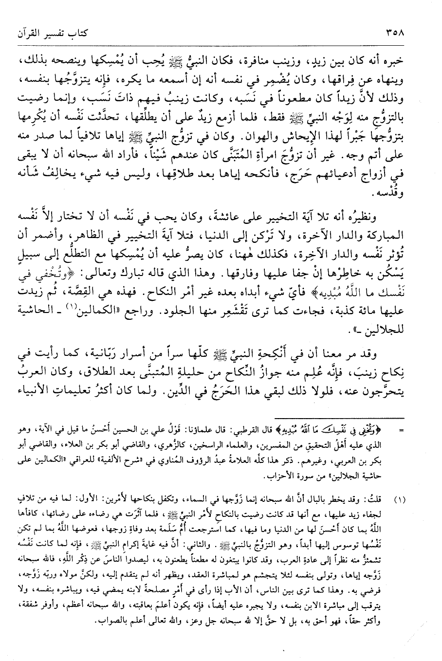 ونظيرُه أنه تلا آيَة التخيير على عائشةَ، وكان يحب في نَفْسه أن لا تختار إلَّا نَفْسه المباركة والدار الآخرة، ولا تَرْكن إلى الدنيا، فتلا آيةَ التخيير في الظاهر، وأضمر أن تُؤثر نَفْسه والدار الآخِرة، فكذلك ههنا، كان يصرُّ عليه أن يُمْسِكها مع التطلُّع إلى سبيلٍ يَسْكُن به خاطِرْها إنْ جفا عليها وفارقِها. وهذا الذي قاله تبارك وتعالى: {وَتُخْفِي فِي نَفْسِكَ مَا اللهُ مُبْدِيهِ} فأيّ شيء أبداه بعده غير أمْر النكاح. فهذه هي القِصَّة، ثُم زيدت عليها مئة كذبة، فجاءت كما ترى تَقْشَعِر منها الجلود. وراجع «الكمالين (¬1) - الحاشية للجلالين -».