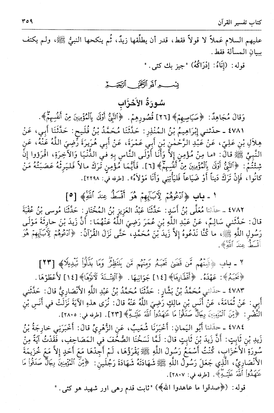 4782 - حَدَّثَنَا مُعَلَّى بْنُ أَسَدٍ حَدَّثَنَا عَبْدُ الْعَزِيزِ بْنُ الْمُخْتَارِ حَدَّثَنَا مُوسَى بْنُ عُقْبَةَ قَالَ حَدَّثَنِى سَالِمٌ عَنْ عَبْدِ اللَّهِ بْنِ عُمَرَ - رضى الله عنهما - أَنَّ زَيْدَ بْنَ حَارِثَةَ مَوْلَى رَسُولِ اللَّهِ - صلى الله عليه وسلم - مَا كُنَّا نَدْعُوهُ إِلَّا زَيْدَ ابْنَ مُحَمَّدٍ حَتَّى نَزَلَ الْقُرْآنُ {ادْعُوهُمْ لِآبَائِهِمْ هُوَ أَقْسَطُ عِنْدَ اللَّهِ}. تحفة 7021 - 146/ 6