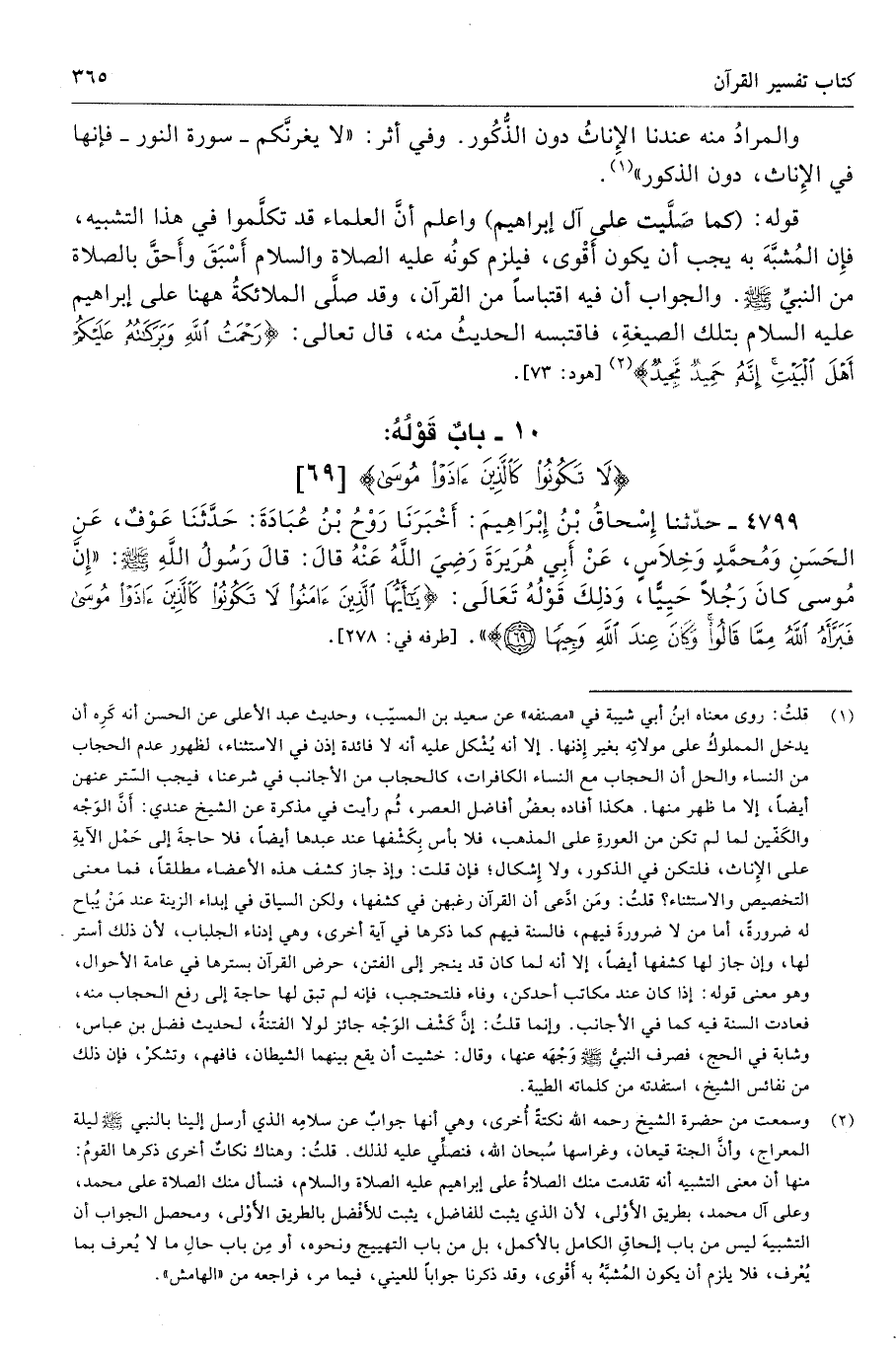 4799 - حَدَّثَنَا إِسْحَاقُ بْنُ إِبْرَاهِيمَ أَخْبَرَنَا رَوْحُ بْنُ عُبَادَةَ حَدَّثَنَا عَوْفٌ عَنِ الْحَسَنِ وَمُحَمَّدٍ وَخِلاَسٍ عَنْ أَبِى هُرَيْرَةَ - رضى الله عنه - قَالَ قَالَ رَسُولُ اللَّهِ - صلى الله عليه وسلم - «إِنَّ مُوسَى كَانَ رَجُلًا حَيِيًّا، وَذَلِكَ قَوْلُهُ تَعَالَى {يَا أَيُّهَا الَّذِينَ آمَنُوا لَا تَكُونُوا كَالَّذِينَ آذَوْا مُوسَى فَبَرَّأَهُ اللهُ مِمَّا قَالُوا وَكَانَ عِنْدَ اللَّهِ وَجِيهًا (69)} طرفاه 278، 3404 تحفة 12242، 14480، 12302 - 152/ 6