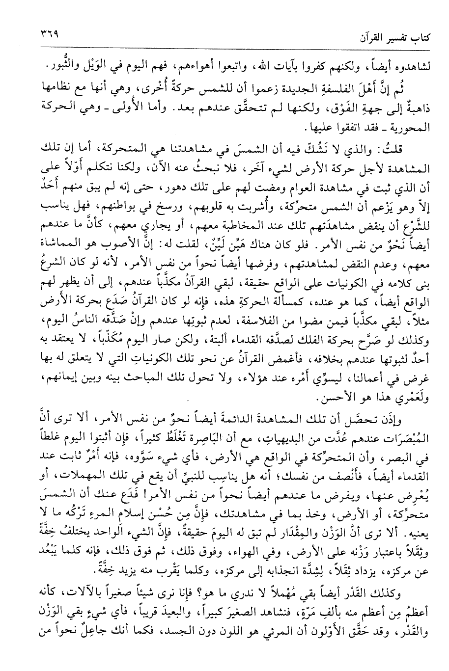 قلتُ: والذي لا نَشُكّ فيه أن الشمسَ في مشاهدتنا هي المتحركة، أما إن تلك المشاهدة لأجل حركة الأرض لشيء آخَر، فلا نبحثُ عنه الآن، ولكنا نتكلم أَوّلًا على أن الذي ثبت في مشاهدة ومضت لهم على تلك دهور، حتى إنه لم يبق منهم أَحَدٌ إلاّ وهو يَزْعم أن الشمس متحرِّكة، وأُشربت به قلوبهم، ورسخ في بواطنهم، فهل يناسب للشَّرْع أن ينقض مشاهدَتهمن تلك عند المخاطبة معهم، أو يجاري معهم، كأنَّ ما عندهم أيضًا نَحْوٌ من نفس الأمر. فلو كان هناك هَيِّن لَيِّنٌ، لقلت له: إنَّ الأصوب هو المماشاة معهم، وعدم النقض لمشاهدتهم، وفرضها أيضًا نحوًا من نفس الأمر، لأنه لو كان الشرعُ بنى كلامه في الكونيات على الواقع حقيقة، لبقي القرآنُ مكذَّبًا عندهم، إلى أن يظهر لهم الواقع أيضًا، كما هو عنده، كمسألة الحركةِ هذه، فإِنه لو كان القرآنُ صَدَع بحركة الأَرض مثلًا، لبقي مكذَّبًا فيمن مضوا من الفلاسفة، لعدم ثبوتِها عندهم وإنْ صَدَّقه الناسُ اليوم، وكذلك لو صَرَّح بحركة الفلك لصدَّقه القدماء ألبتة، ولكن صار اليوم مُكَذّبًا، لا يعتقد به أحدٌ لثبوتها عندهم بخلافه، فأغمض القرآنُ عن نحو تلك الكونياتِ التي لا يتعلق له بها غرض في أعمالنا، ليسوِّي أَمْره عند هؤلاء، ولا تحول تلك المباحث بينه وبين إيمانهم، ولَعَمْري هذا هو الأحسن.