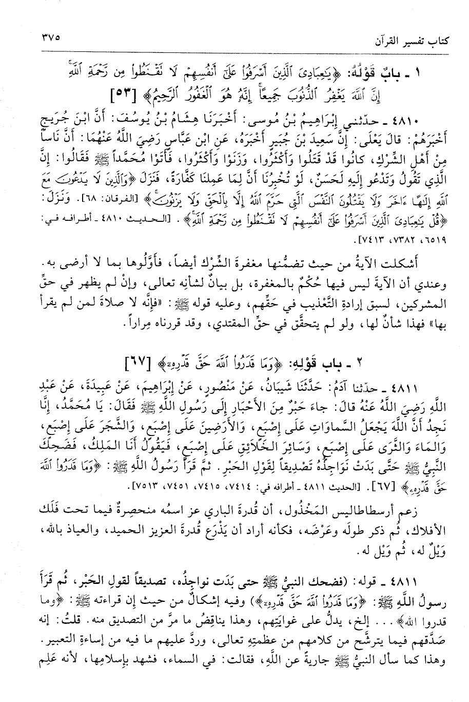 4810 - حَدَّثَنِى إِبْرَاهِيمُ بْنُ مُوسَى أَخْبَرَنَا هِشَامُ بْنُ يُوسُفَ أَنَّ ابْنَ جُرَيْجٍ أَخْبَرَهُمْ قَالَ يَعْلَى إِنَّ سَعِيدَ بْنَ جُبَيْرٍ أَخْبَرَهُ عَنِ ابْنِ عَبَّاسٍ - رضى الله عنهما - أَنَّ نَاسًا مِنْ أَهْلِ الشِّرْكِ كَانُوا قَدْ قَتَلُوا وَأَكْثَرُوا وَزَنَوْا وَأَكْثَرُوا، فَأَتَوْا مُحَمَّدًا - صلى الله عليه وسلم - فَقَالُوا إِنَّ الَّذِى تَقُولُ وَتَدْعُو إِلَيْهِ لَحَسَنٌ لَوْ تُخْبِرُنَا أَنَّ لِمَا عَمِلْنَا كَفَّارَةً. فَنَزَلَ {وَالَّذِينَ لَا يَدْعُونَ مَعَ اللَّهِ إِلَهًا آخَرَ وَلَا يَقْتُلُونَ النَّفْسَ الَّتِي حَرَّمَ اللَّهُ إِلَّا بِالْحَقِّ وَلَا يَزْنُونَ} [الفرقان: 68] وَنَزَلَ {قُلْ يَا عِبَادِيَ الَّذِينَ أَسْرَفُوا عَلَى أَنْفُسِهِمْ لَا تَقْنَطُوا مِنْ رَحْمَةِ اللَّهِ}. تحفة 5652