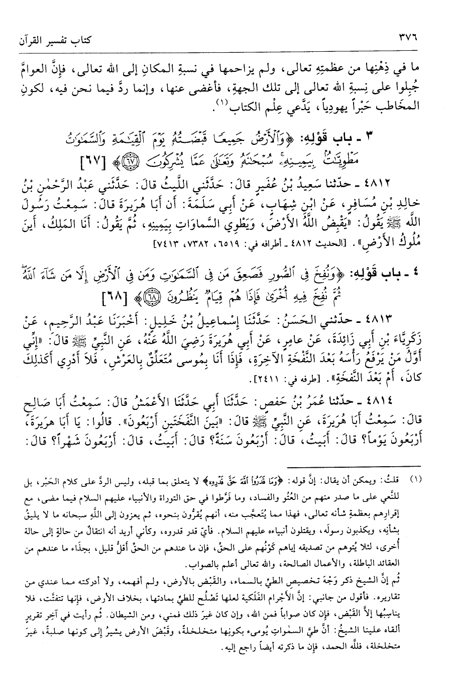 4 - باب قَوْلِهِ: {وَنُفِخَ فِي الصُّورِ فَصَعِقَ مَنْ فِي السَّمَاوَاتِ وَمَنْ فِي الْأَرْضِ إِلَّا مَنْ شَاءَ اللهُ ثُمَّ نُفِخَ فِيهِ أُخْرَى فَإِذَا هُمْ قِيَامٌ يَنْظُرُونَ (68)} [الزمر: 68]